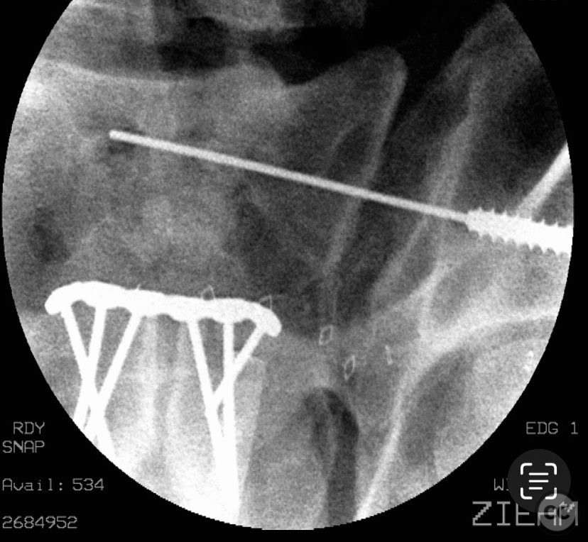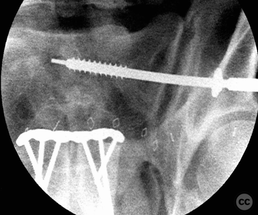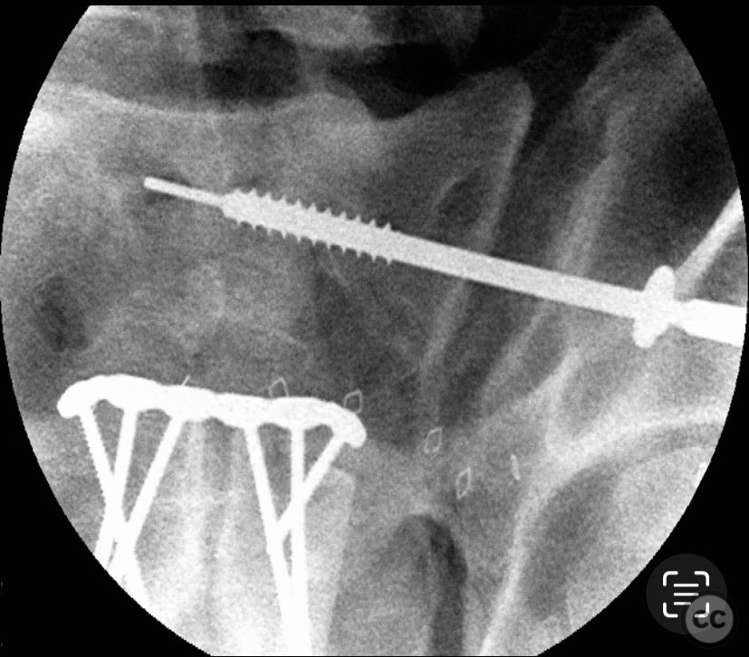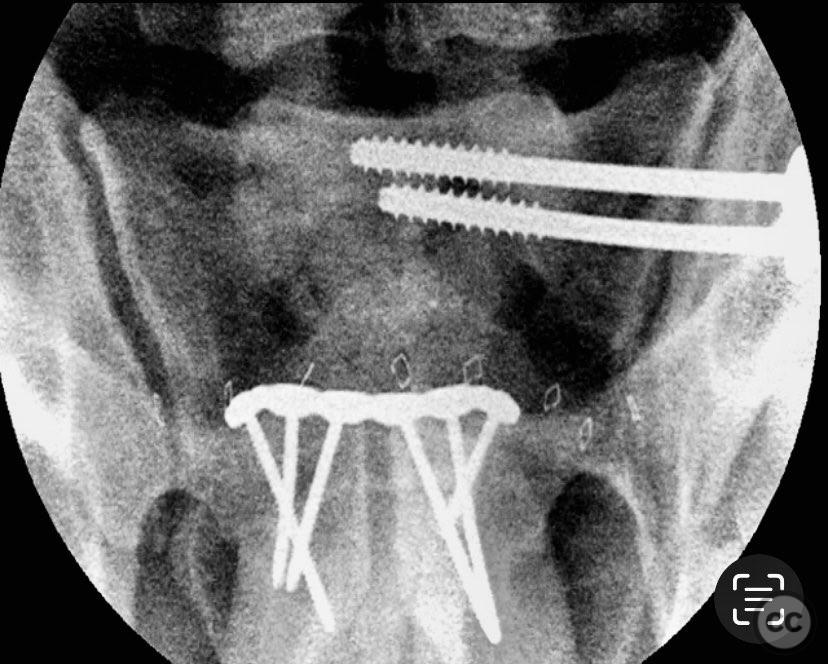 Operative remarks:The intraoperative course revealed that indirect reduction of the incomplete SI joint injury via anterior stabilization was insufficient, necessitating direct percutaneous fixation. A single cannulated iliosacral oblique lag screw was inserted under fluoroscopic control, achieving reduction, compression, and stabilization of the SI joint. Surgeon-specific technical consideration included avoidance of large-diameter drills for the posterior ilium due to limited bone stock (approximately 3 cm of ilium available for purchase), and the preference for an appropriately sized washer to optimize compression without risking iatrogenic fracture.