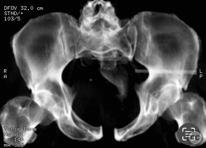 Anatomical surgical approach: A lower midline infraumbilical incision was made to expose the symphysis pubis. Subperiosteal dissection was performed to mobilize the rectus abdominis insertions and expose the pubic bodies. A pelvic reduction clamp was applied with tines docked in dense bone or soft tissue as dictated by local tissue quality, oriented to correct deformity while avoiding interference with planned plate placement. Following reduction, a contoured anterior symphyseal plate was applied and secured with cortical screws. Upon removal of the clamp, persistent SI joint malreduction was noted. Under fluoroscopic guidance, a percutaneous pathway was prepared for a cannulated iliosacral lag screw, traversing the posterior ilium into the upper sacral segment, ensuring safe passage relative to neurovascular structures.