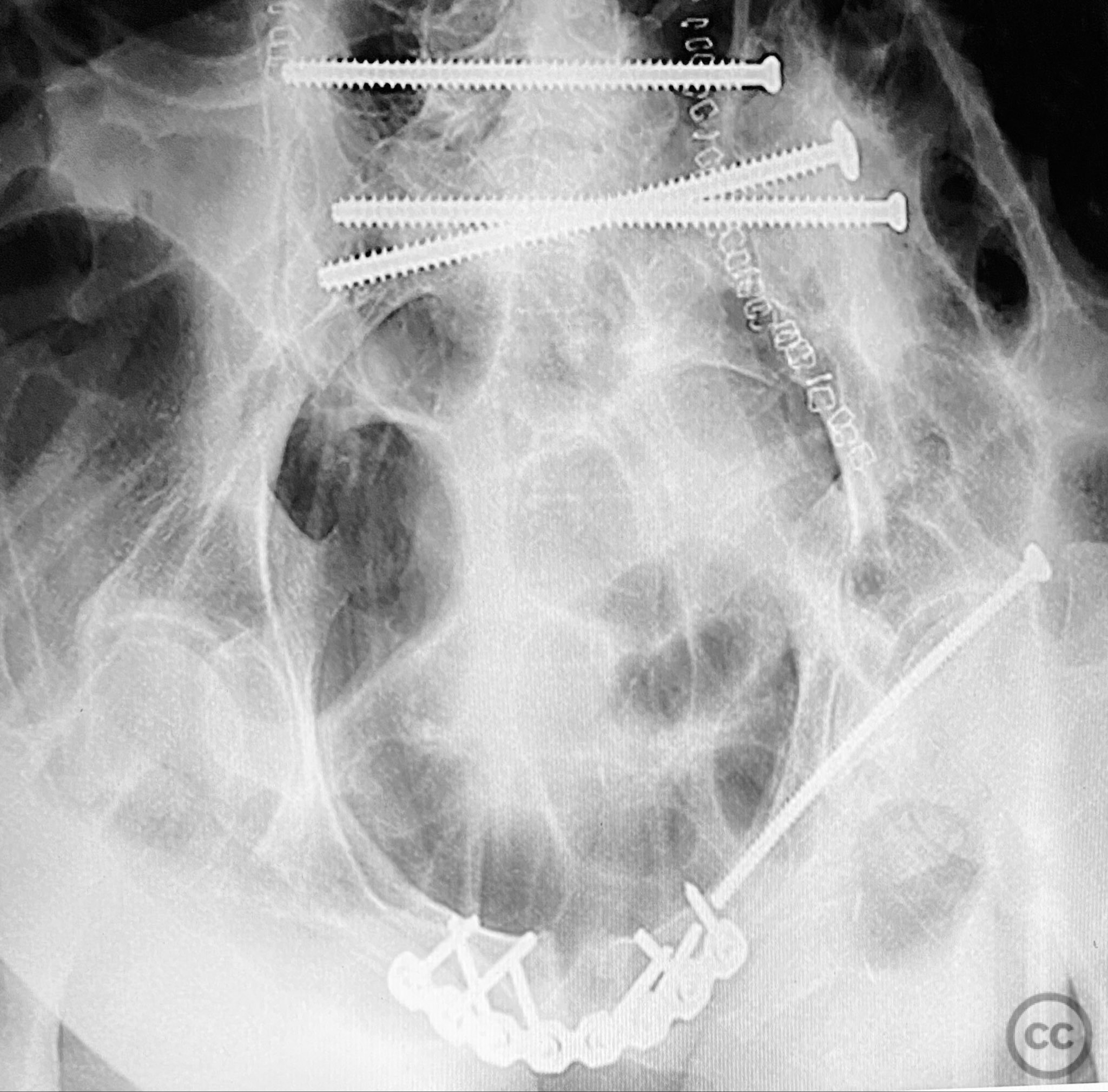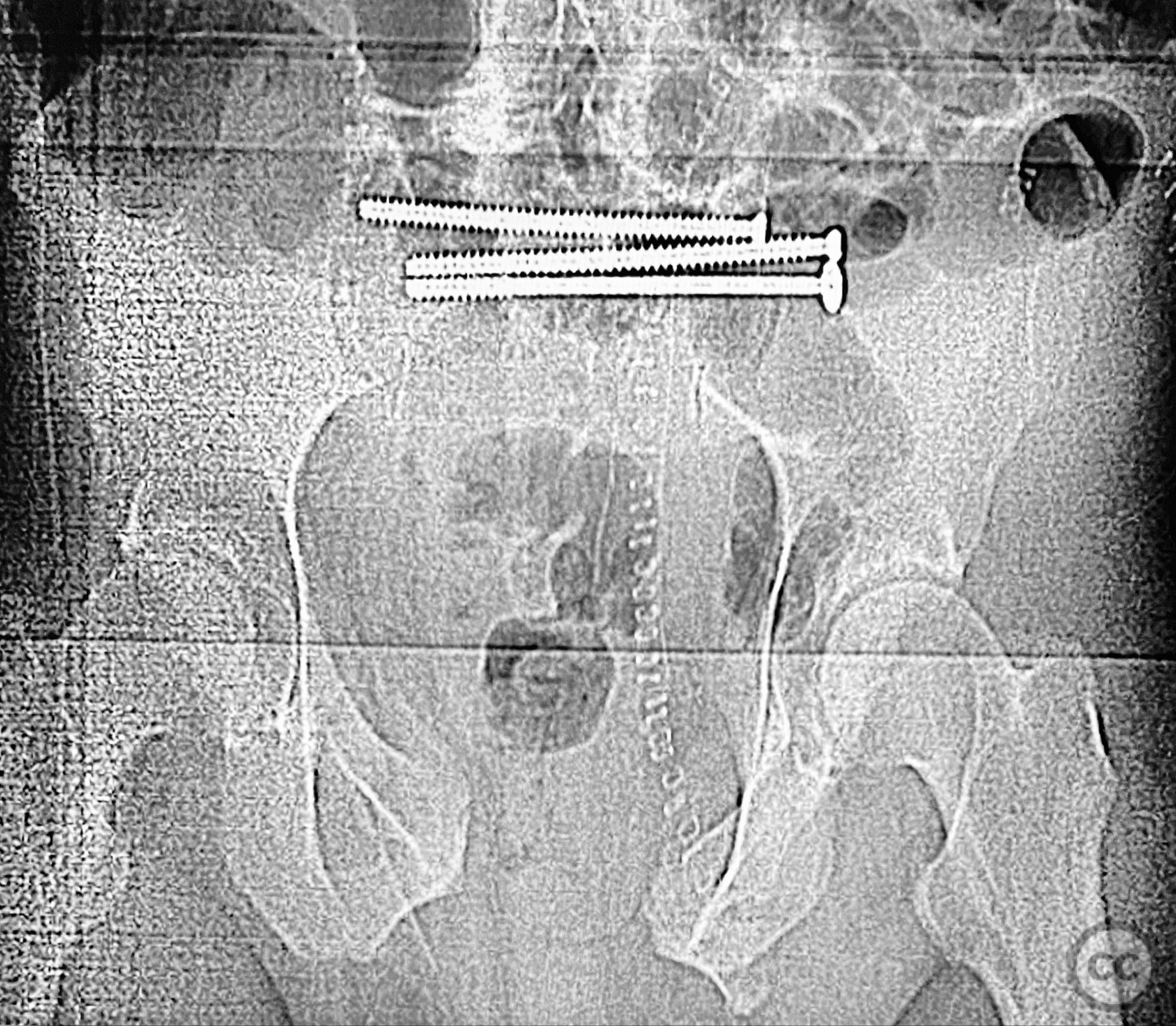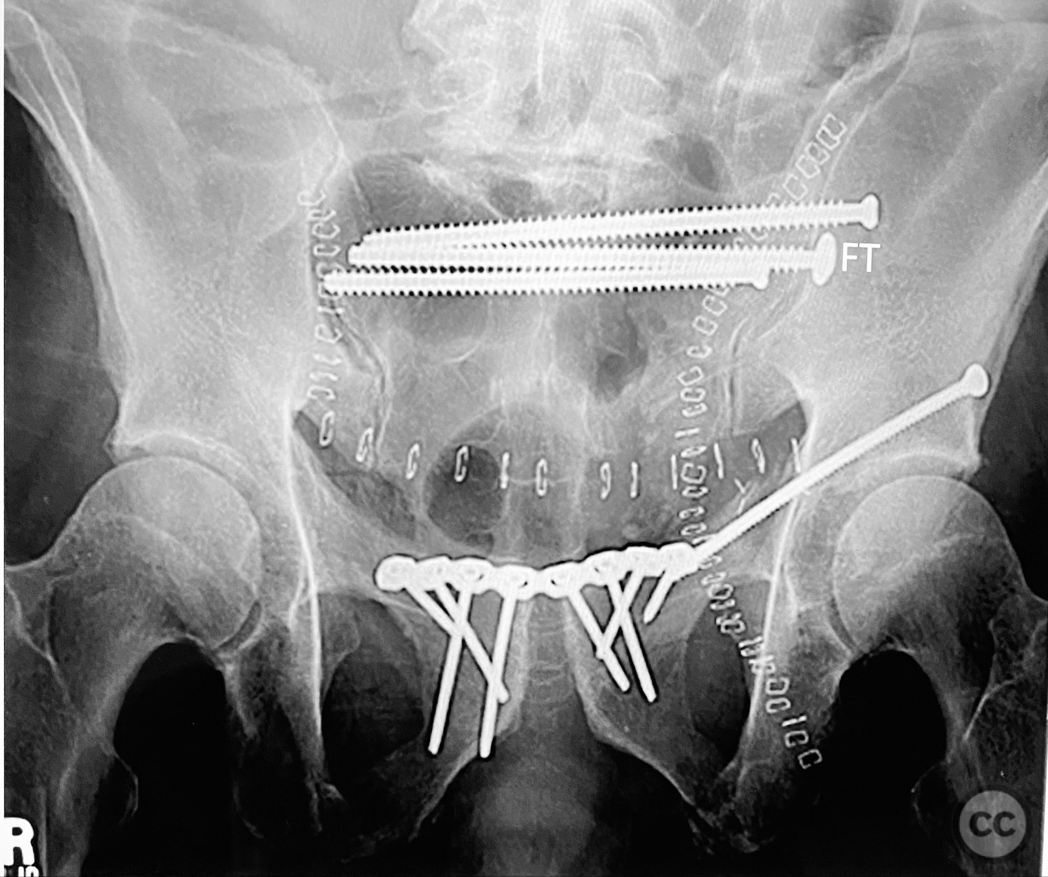 Operative remarks:The posterior reduction was facilitated by direct visualization of the dorsal sacral cortex, allowing precise assessment and clamping of the comminuted fragments prior to screw fixation. The iliosacral screws were placed without cannulated instrumentation longer than 130mm, reflecting historical implant limitations at the time of surgery. Postoperative CT confirmed satisfactory reduction and fixation of the posterior ring, though suboptimal positioning of iliosacral screws was noted (contained within the osseous fixation pathway but not optimized for maximal safety or precision). The anterior ring was subsequently addressed in a staged fashion, with anatomical reduction and stable fixation achieved via open technique. This case highlights technical challenges in achieving optimal screw trajectory and length, particularly with historical implant constraints, as well as the importance of staged management in complex pelvic ring disruptions.