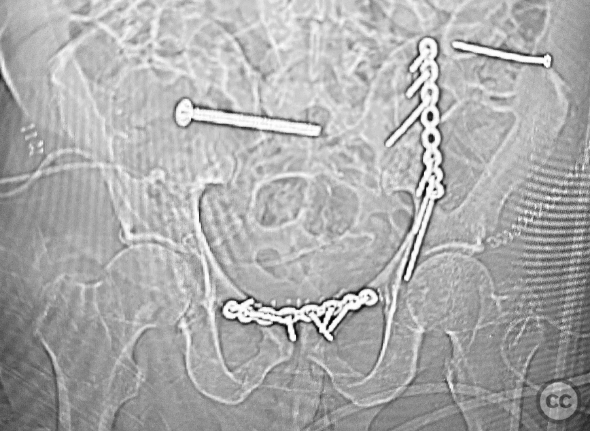 Operative remarks:Accurate anatomical reduction was achieved at both the iliac crest and pelvic brim using direct clamp application. Stable fixation was performed at each site according to biomechanical principles, utilizing plates and/or screws as indicated by fragment size and displacement. For closure of the symphysis pubis, interrupted 2-0 Vicryl pop-off sutures on a non-cutting needle were used for the midline portion, with additional 0 Vicryl sutures for reinforcement at the tendon insertion area.