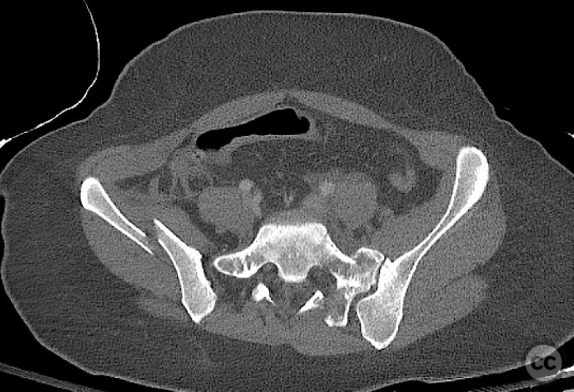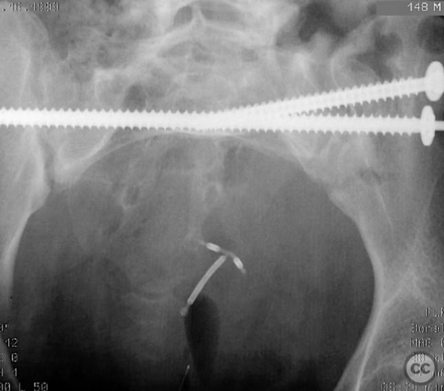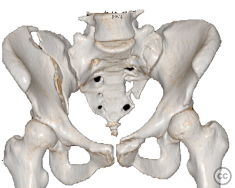 Clinical and radiological findings: A 26-year-old female sustained a closed pelvic ring injury following a motor vehicle accident. She was hemodynamically stable, neurologically intact, and had no other associated injuries. Skin integrity was preserved. Initial management included pelvic binder application and 10 pounds of distal femoral skeletal traction. Portable AP pelvic radiograph demonstrated a left-sided sacral fracture with associated ipsilateral iliac wing and pubic ramus fractures, consistent with an AO/OTA 61-B2 (lateral compression type II) injury pattern.