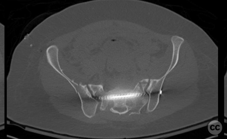 Orthopaedic implants used: Two 7mm diameter cannulated fully threaded medullary screws (iliac crest and pelvic brim), percutaneous iliosacral screw(s).