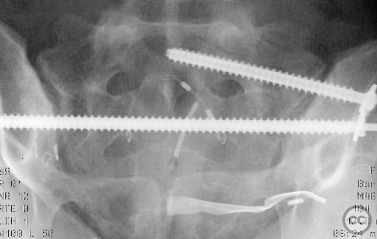 Operative remarks:Intraoperatively, minimal residual deformity of the left hemipelvis was noted after traction and positioning. The sacral fracture was stabilized first with iliosacral screws. The anterior iliac exposure allowed for direct visualization, cleaning, reduction, and clamping of the iliac wing fracture prior to screw fixation. After fixation, intraoperative fluoroscopic stress examination demonstrated stability of the left pubic ramus fracture and overall pelvic ring, obviating the need for further anterior fixation.