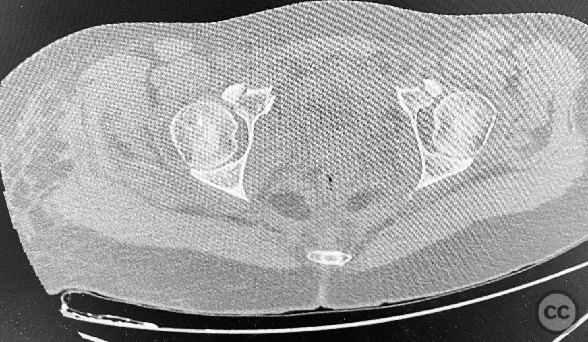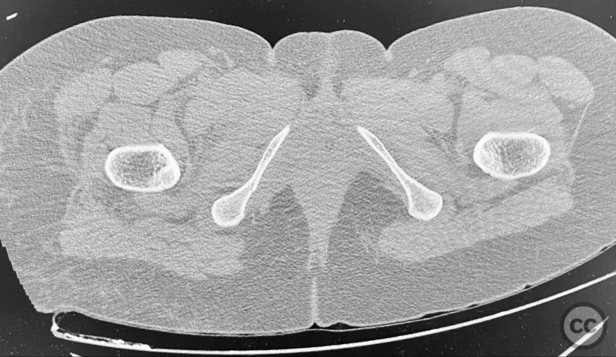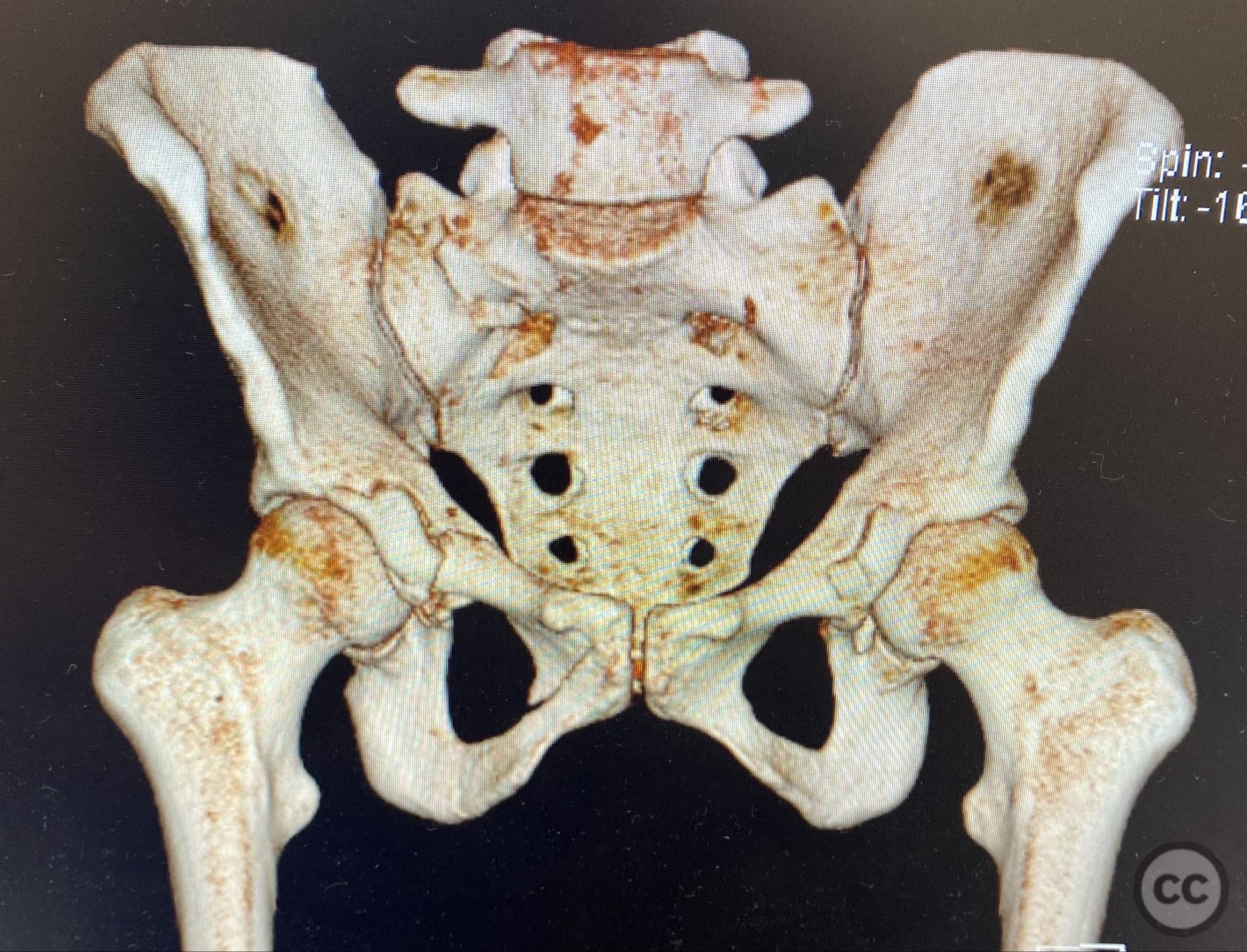 Clinical and radiological findings: A middle-aged patient involved in a motor vehicle collision presented initially with a closed ankle fracture-dislocation and minimal pelvic complaints. Following closed reduction and splinting of the ankle, the patient developed severe pelvic pain (9/10) with any attempted movement. Neurological and vascular examination was not specified. Computed tomography demonstrated minimally displaced fractures of the posterior ilium, sacral ala, and bilateral pubic rami. AP CT surface renderings revealed subtle but clinically significant displacement and deformity of the pelvic ring, which was difficult to appreciate on standard axial images.