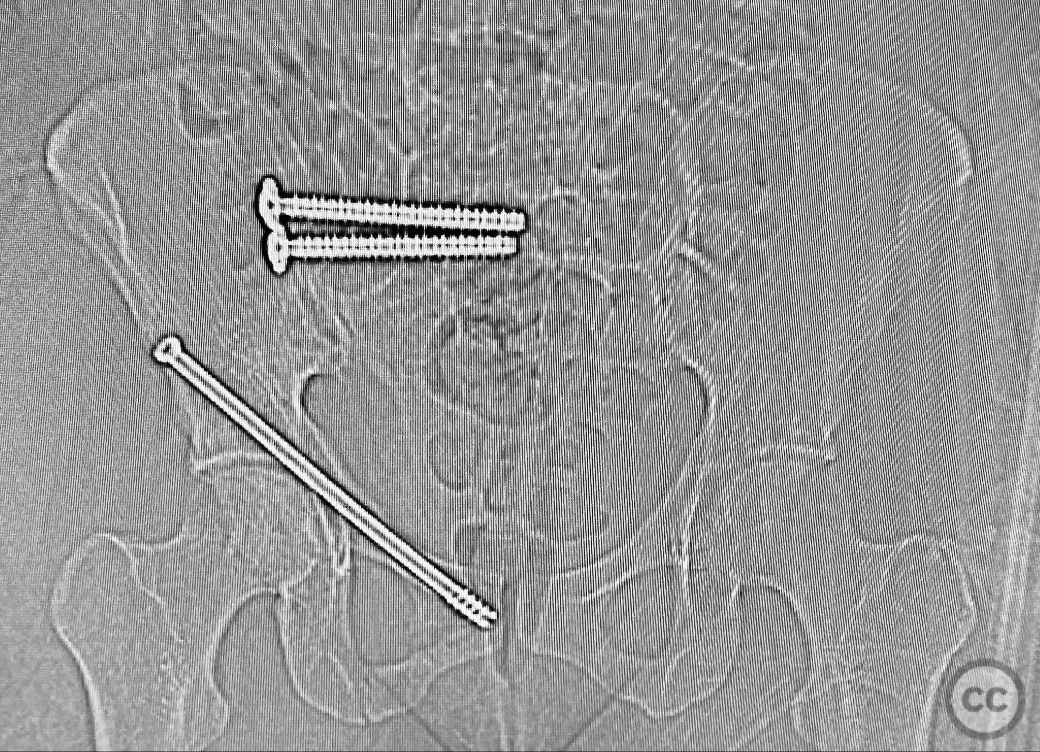 Anatomical surgical approach: Percutaneous approach: Small stab incisions were made over the crista iliaca and sacral entry points as determined by preoperative imaging. Under fluoroscopic guidance, guidewires were advanced across the sacroiliac joint and sacral ala as indicated. Cannulated screws were inserted percutaneously to stabilize the unstable posterior pelvic ring and rami fractures.