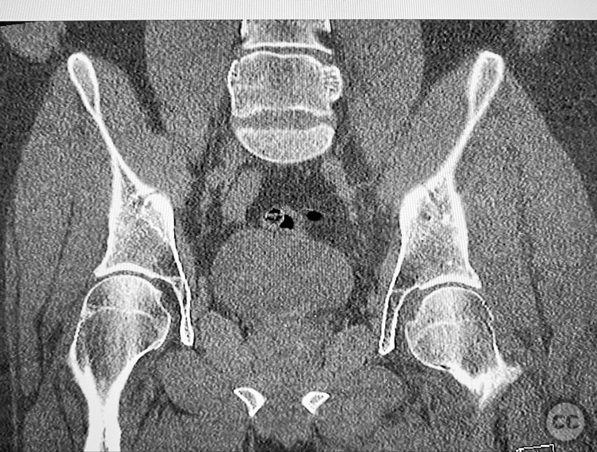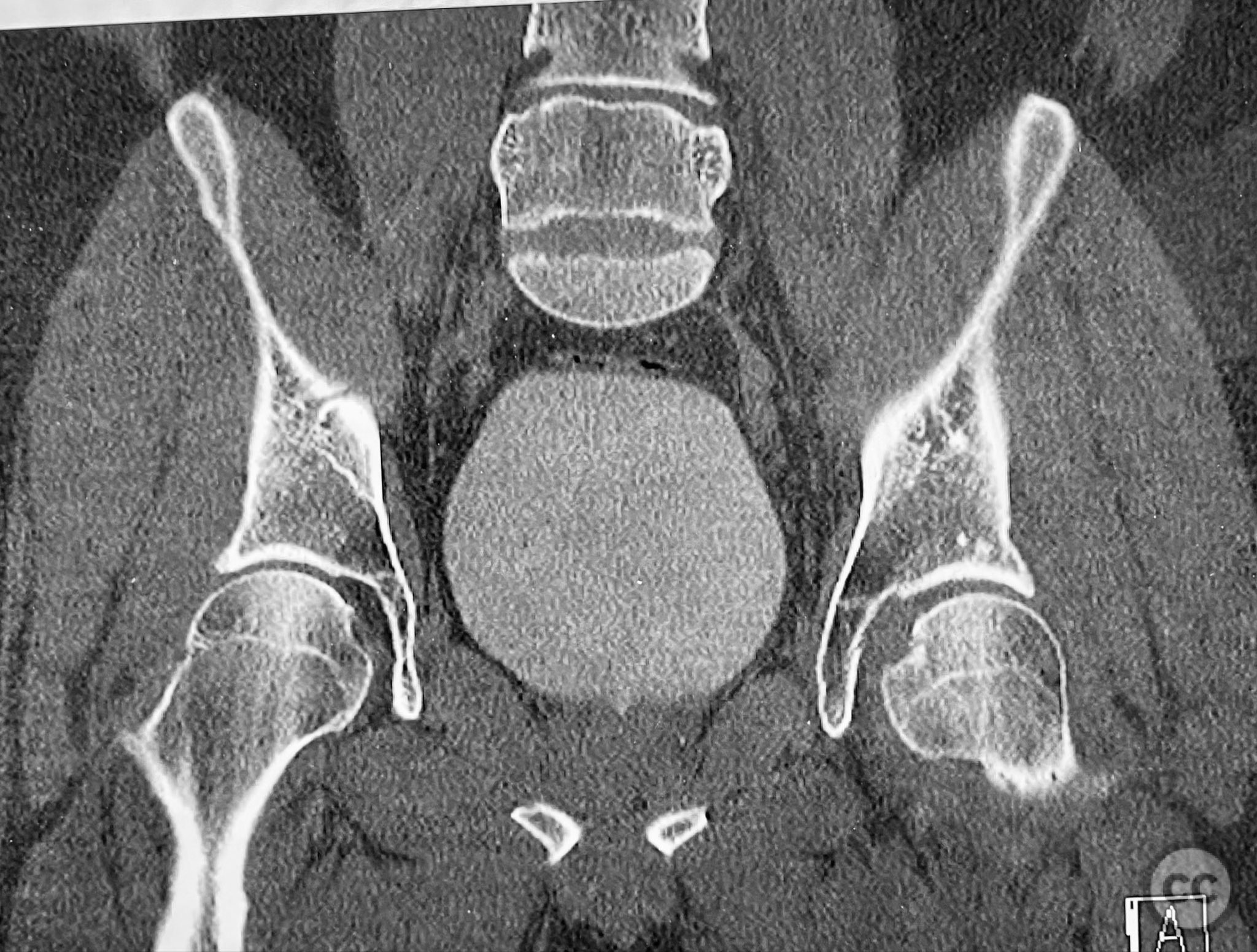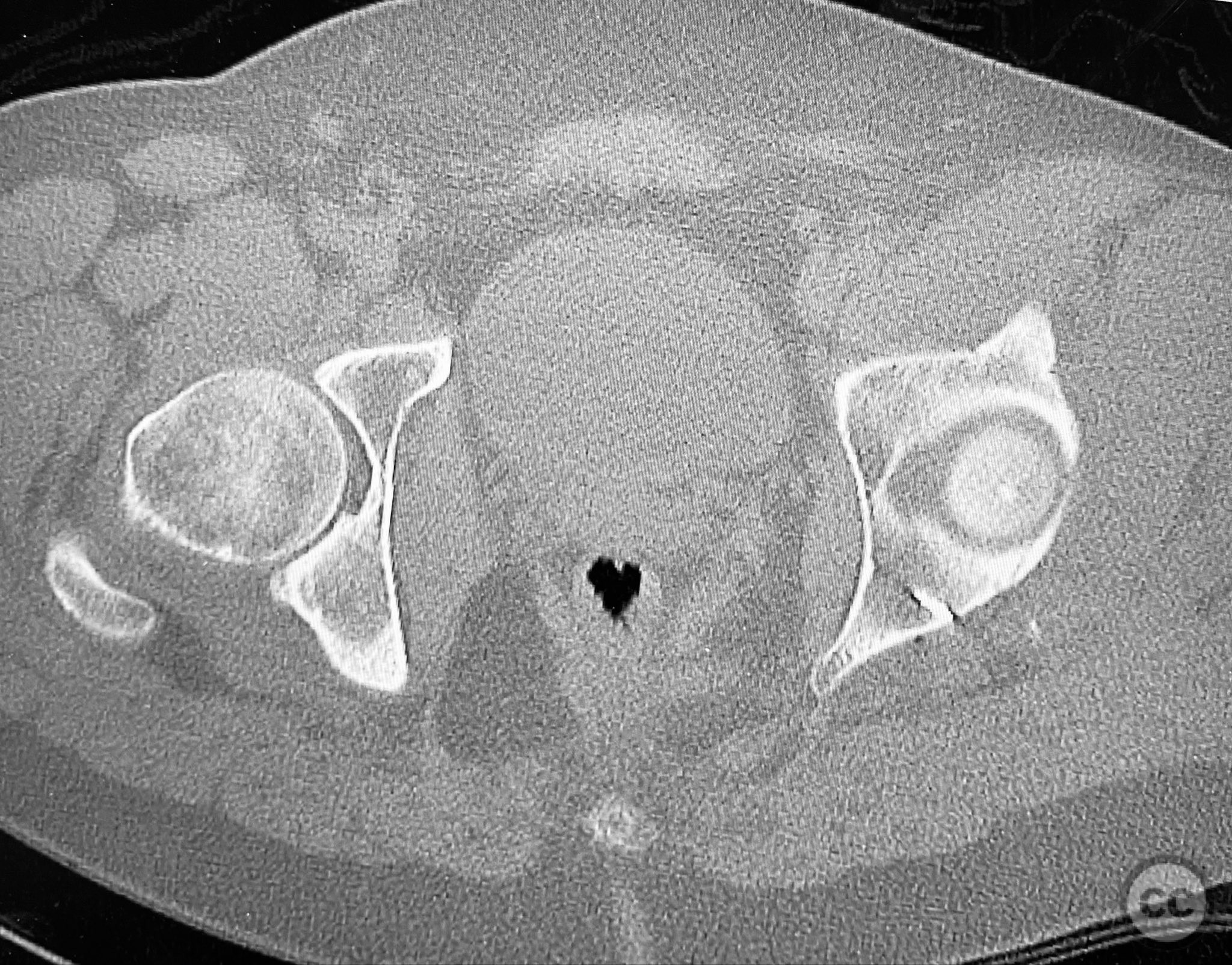 Clinical and radiological findings: A patient involved in a motor vehicle collision presented with left hip pain exacerbated by any attempted movement. Initial axial and surface-rendered computed tomography (CT) imaging demonstrated an essentially nondisplaced posterior wall (PW) acetabular fracture (AO/OTA 62-A1.1). However, the anteroposterior (AP) scan image and coronal reconstructions revealed significant hip joint asymmetry. Examination under anesthesia with fluoroscopic guidance confirmed persistent joint incongruity, with the femoral head subluxating posteriorly at 50–60 degrees of flexion. A pure chondral fragment was identified as being interposed between the femoral head and the intact region of the posterior wall, accounting for the clinical and radiological asymmetry.