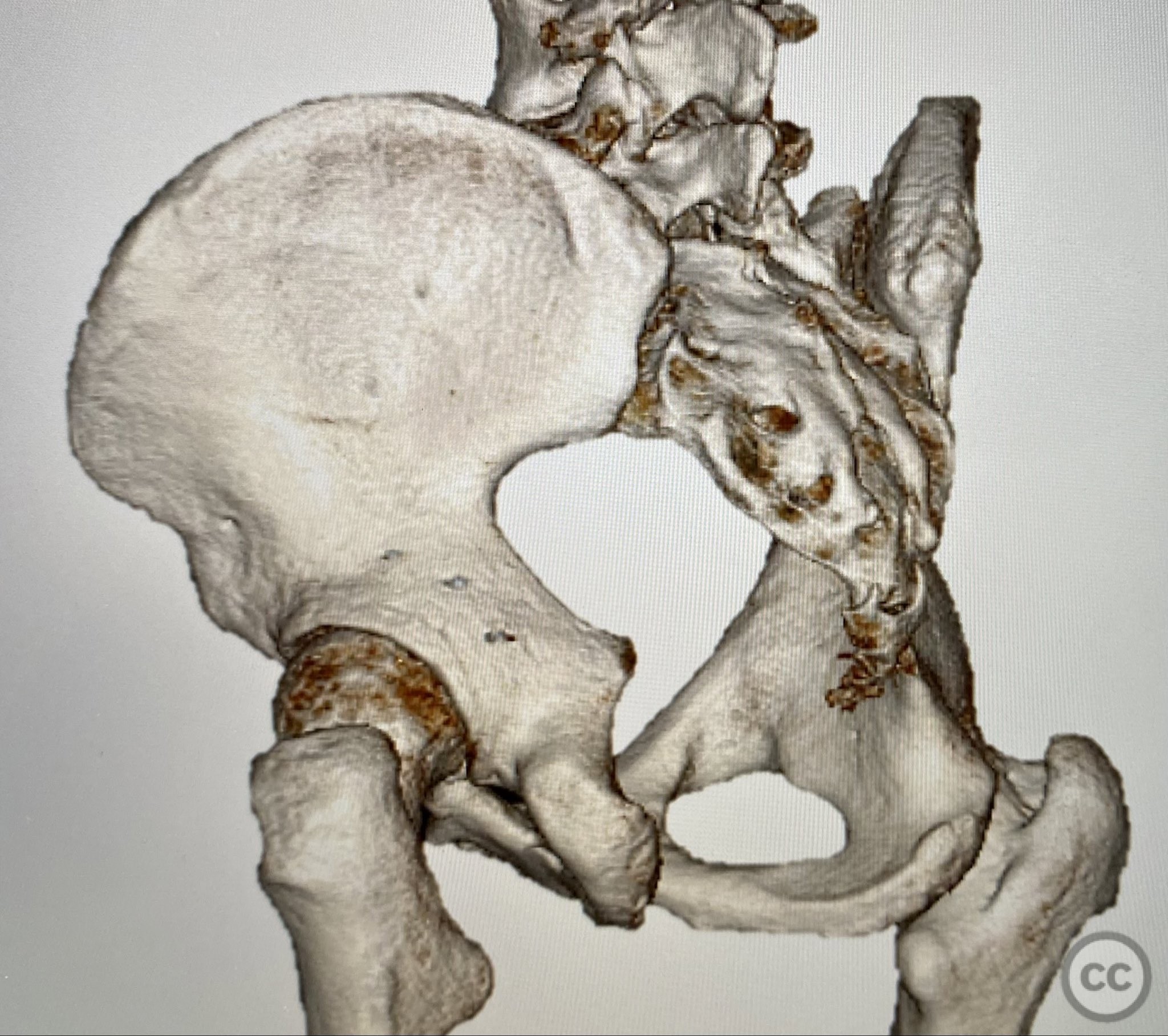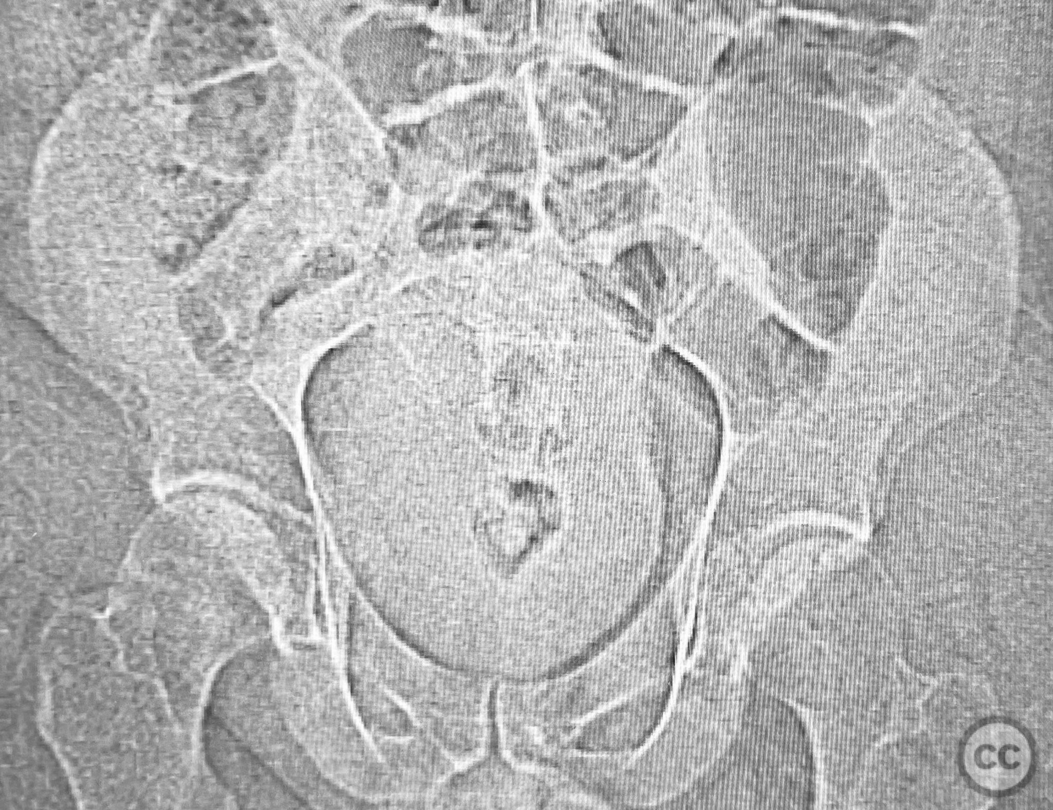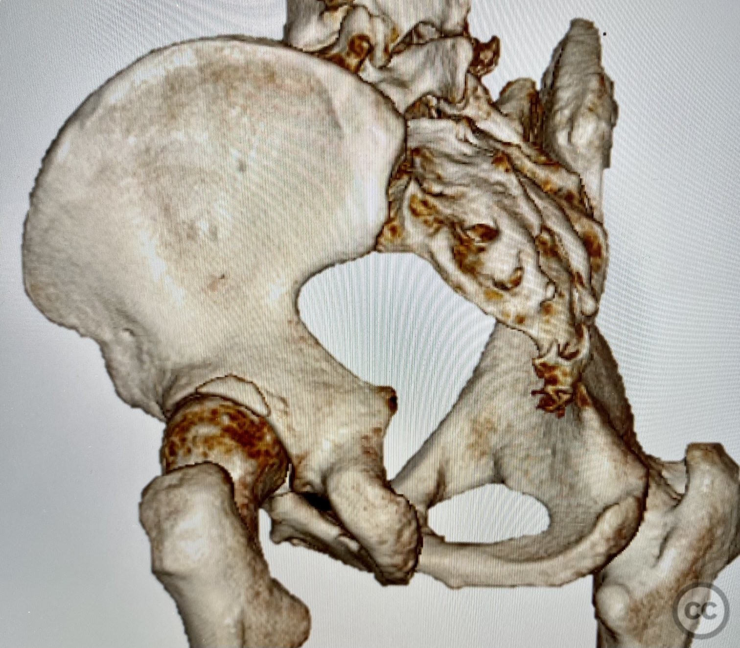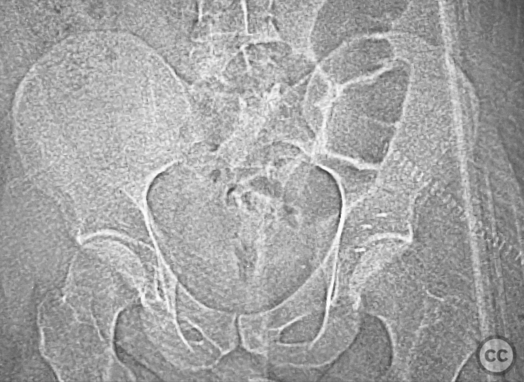 Clinical and radiological findings: A patient involved in a motor vehicle collision presented with left hip pain exacerbated by any attempted movement. Initial axial and surface-rendered computed tomography (CT) imaging demonstrated an essentially nondisplaced posterior wall (PW) acetabular fracture (AO/OTA 62-A1.1). However, the anteroposterior (AP) scan image and coronal reconstructions revealed significant hip joint asymmetry. Examination under anesthesia with fluoroscopic guidance confirmed persistent joint incongruity, with the femoral head subluxating posteriorly at 50–60 degrees of flexion. A pure chondral fragment was identified as being interposed between the femoral head and the intact region of the posterior wall, accounting for the clinical and radiological asymmetry.