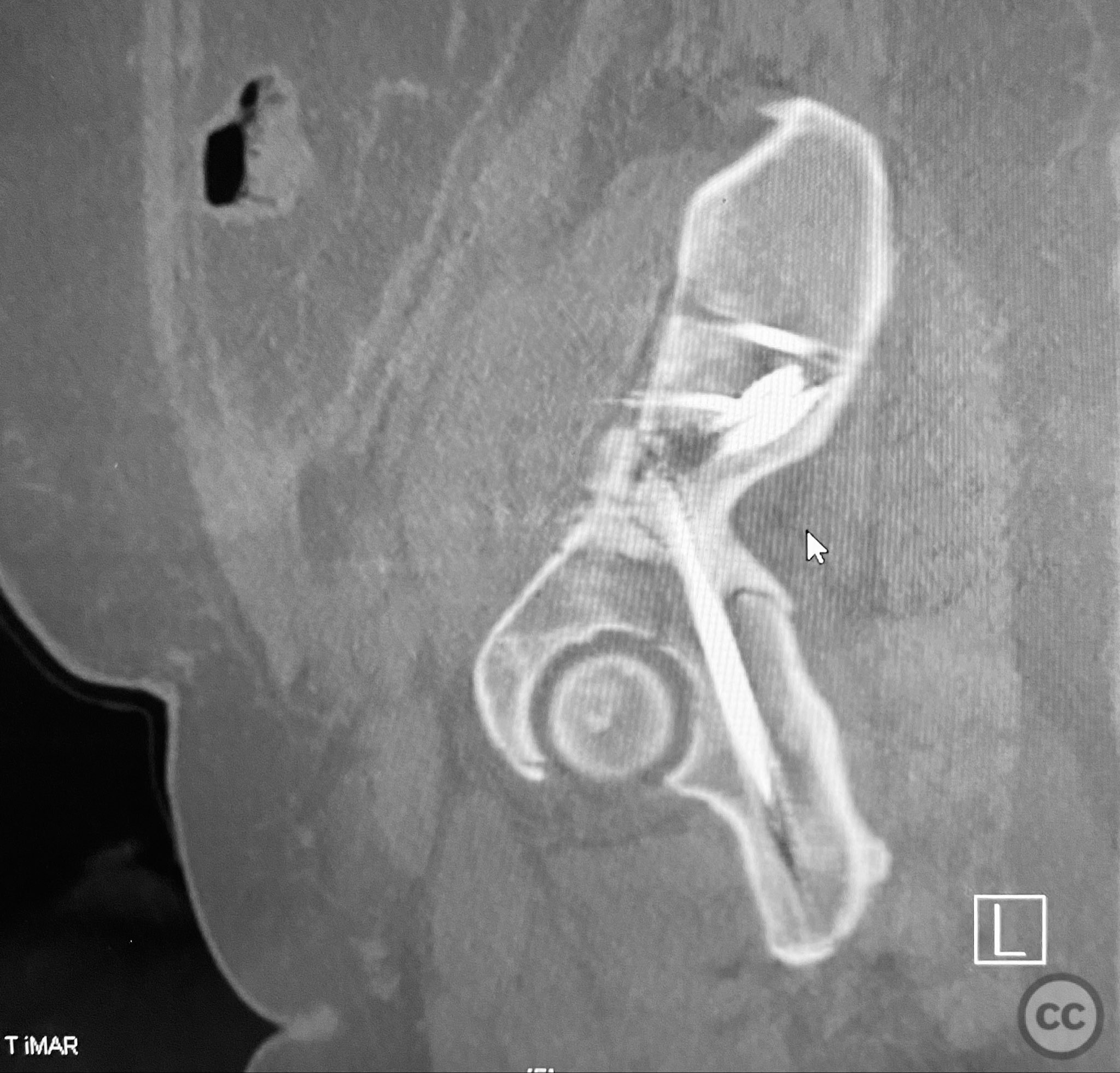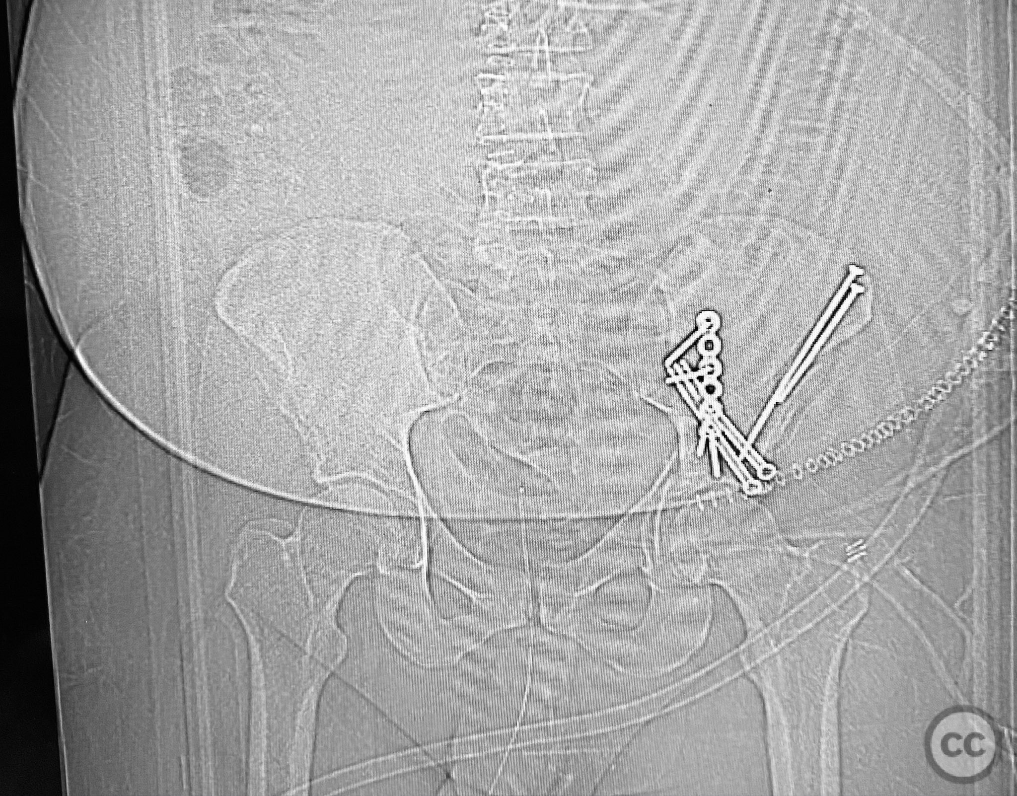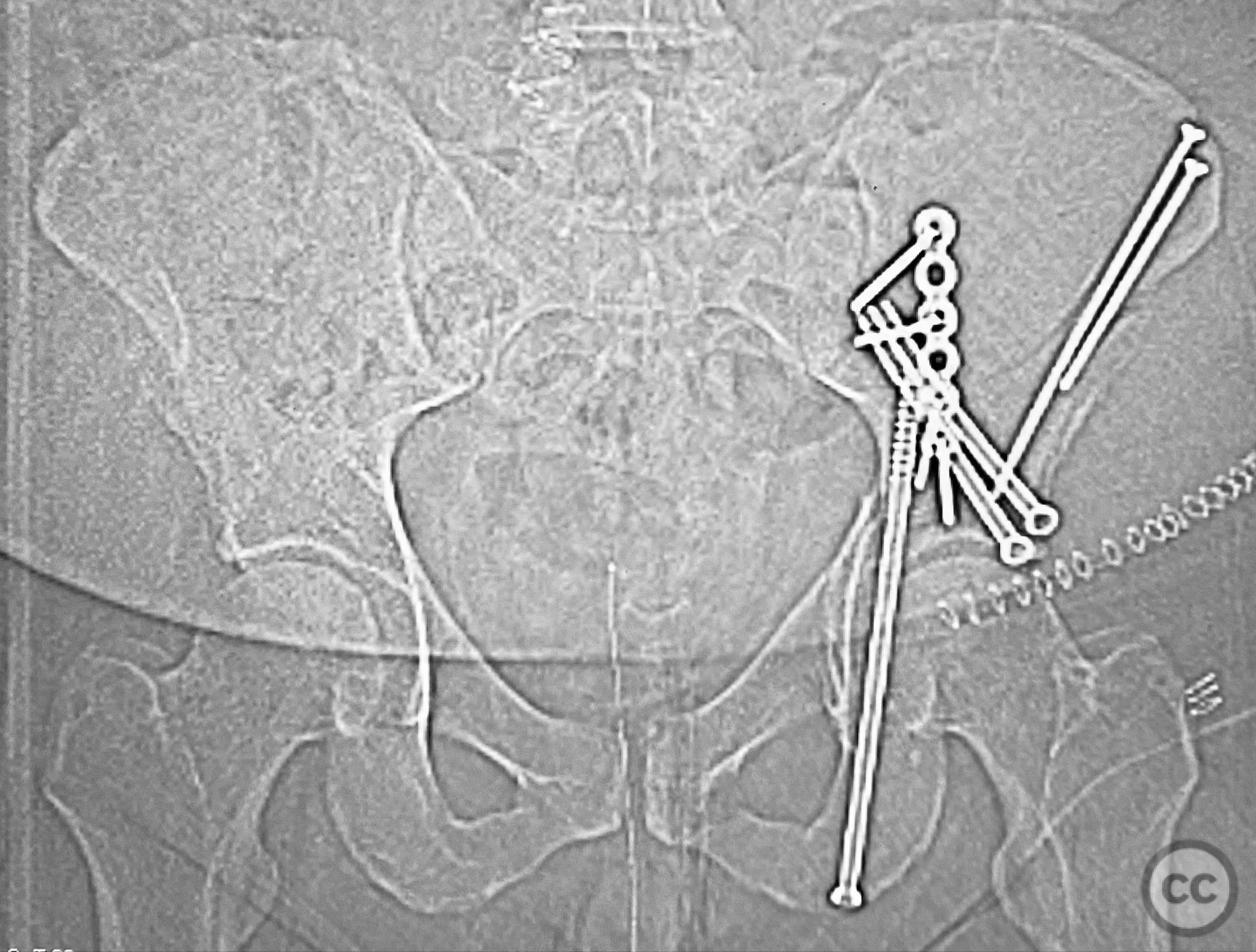 Operative remarks:The operative sequence was dictated by the patient’s overall clinical status, necessitating staged management. Intraoperative attention was paid to implant placement during AC fixation to preserve access for subsequent percutaneous PC fixation. Postoperative CT confirmed satisfactory reduction and fixation of both columns, with appropriate implant positioning and no evidence of neurovascular compromise or significant soft tissue complications.