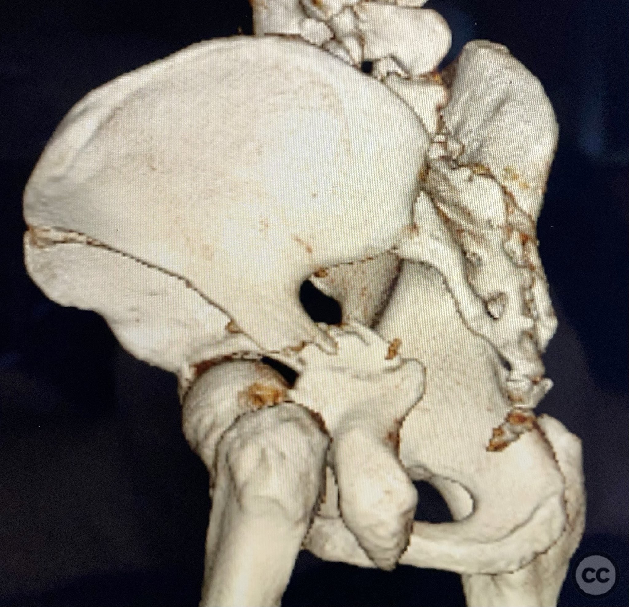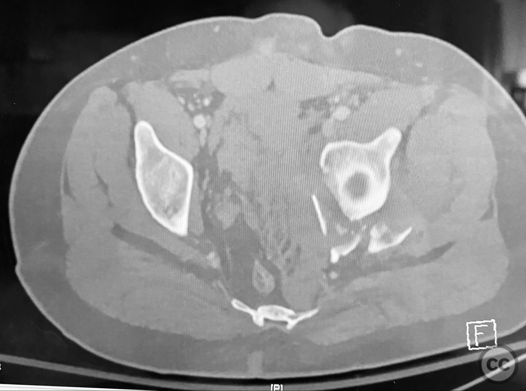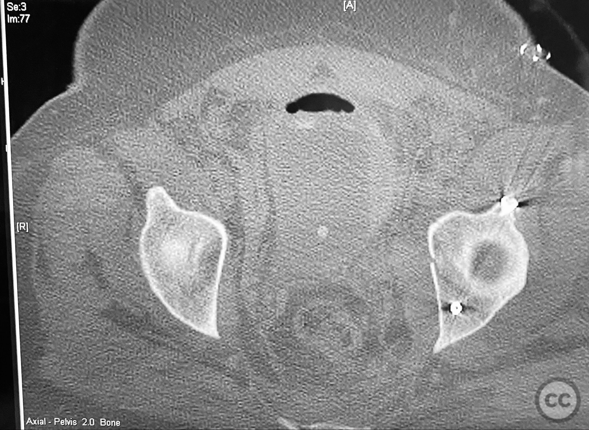 Clinical and radiological findings: A patient presented with a displaced associated both column acetabular fracture, characterized radiographically by the presence of the "spur sign" on the anteroposterior (AP) pelvis film, indicating the caudal aspect of the intact ilium exposed by medial displacement of the articular fragments. The spur was more clearly visualized on the obturator oblique rendered image. Axial computed tomography (CT) images demonstrated the intact ilium, medially displaced anterior column (AC) and posterior column (PC) fragments, and provided detailed visualization of surrounding soft tissues, including vascular structures enhanced by contrast. Multiplanar CT reconstructions (axial, sagittal, coronal) and 3D renderings were utilized for comprehensive fracture and soft tissue assessment. The patient’s overall clinical condition was a significant factor in surgical planning.