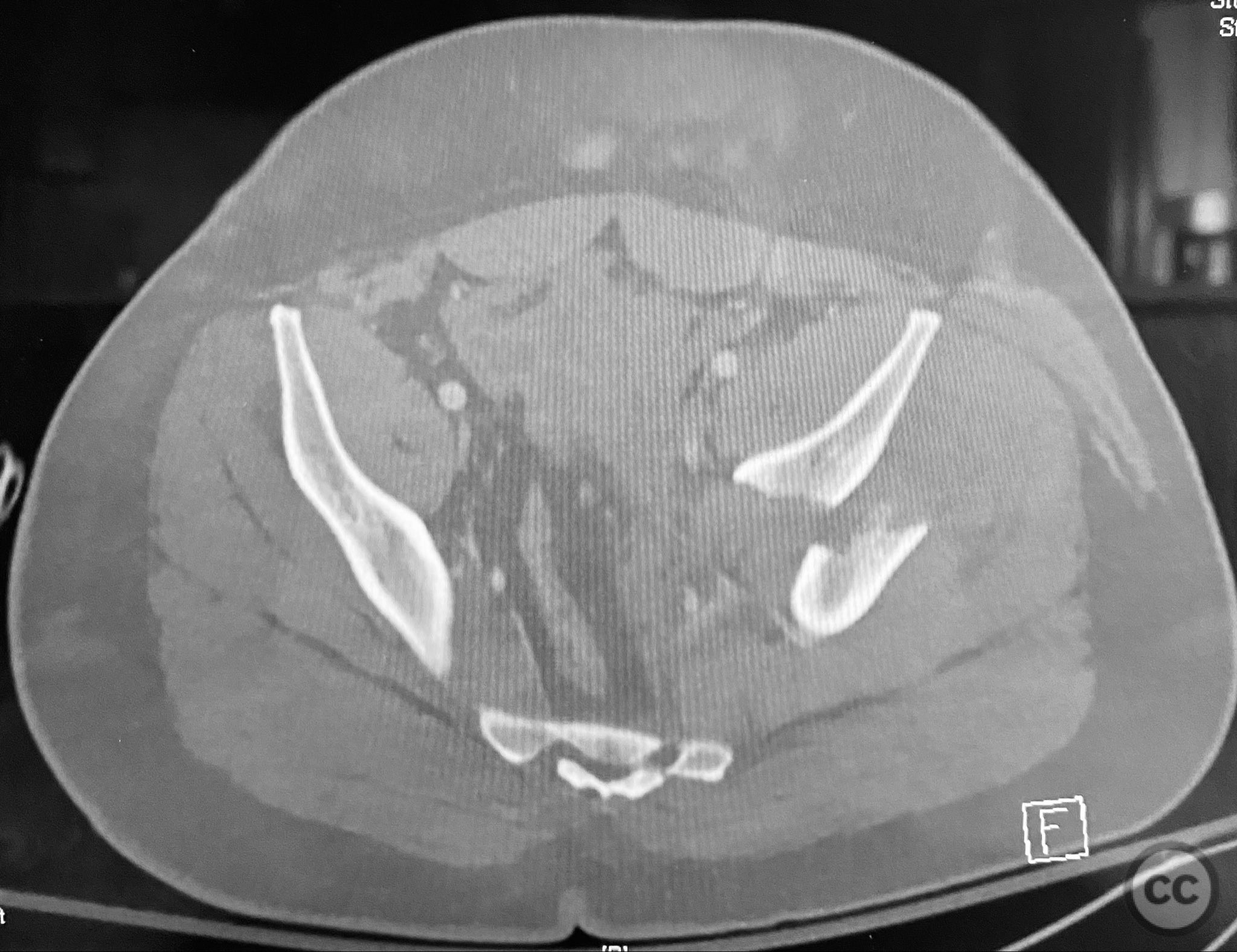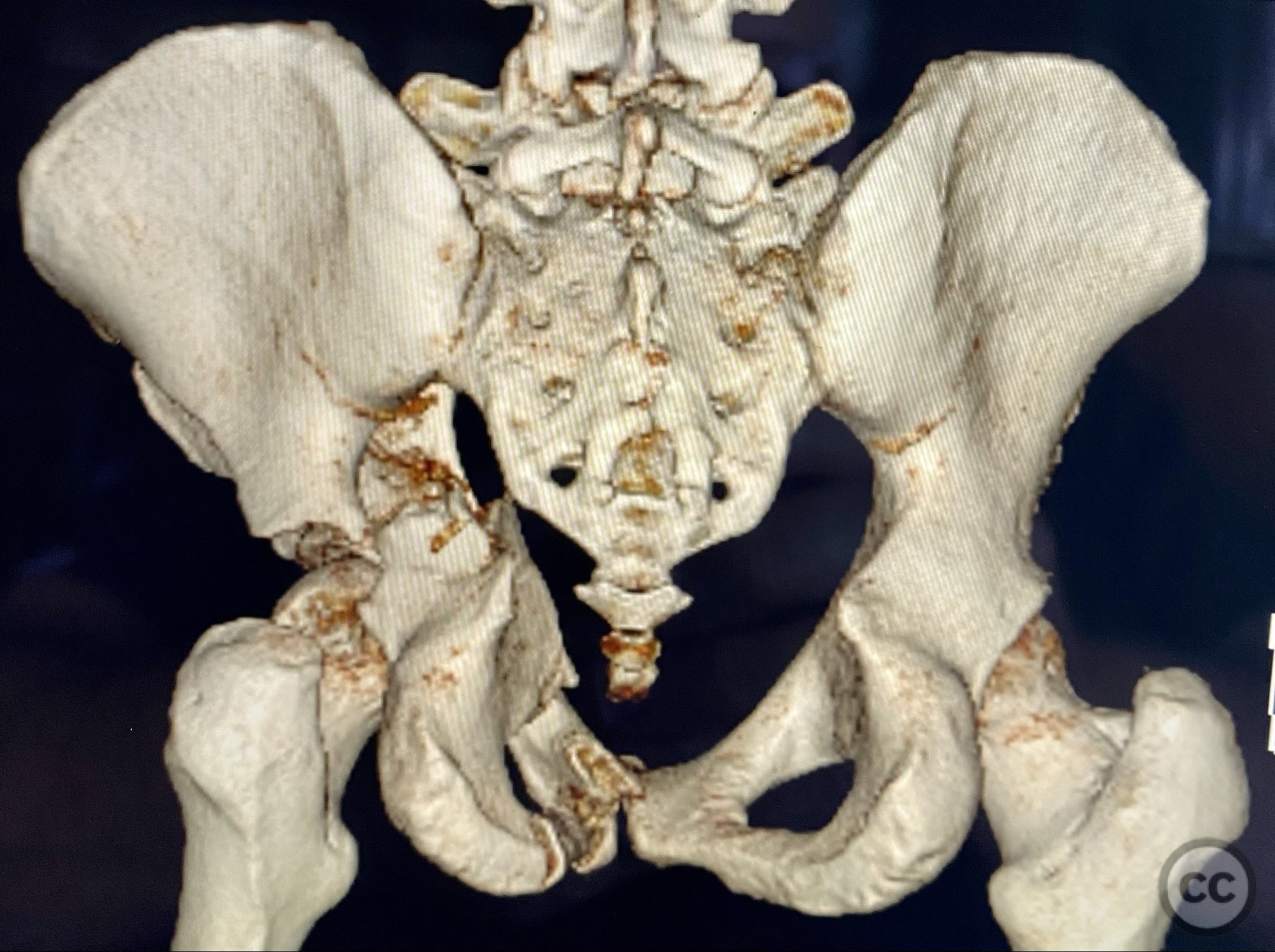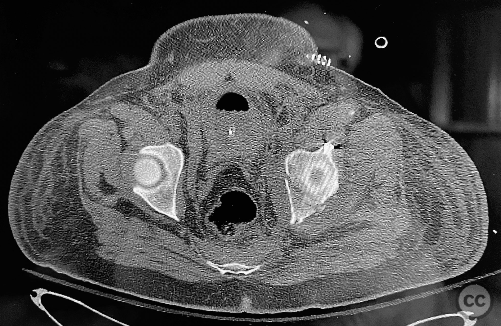 Clinical and radiological findings: A patient presented with a displaced associated both column acetabular fracture, characterized radiographically by the presence of the "spur sign" on the anteroposterior (AP) pelvis film, indicating the caudal aspect of the intact ilium exposed by medial displacement of the articular fragments. The spur was more clearly visualized on the obturator oblique rendered image. Axial computed tomography (CT) images demonstrated the intact ilium, medially displaced anterior column (AC) and posterior column (PC) fragments, and provided detailed visualization of surrounding soft tissues, including vascular structures enhanced by contrast. Multiplanar CT reconstructions (axial, sagittal, coronal) and 3D renderings were utilized for comprehensive fracture and soft tissue assessment. The patient’s overall clinical condition was a significant factor in surgical planning.