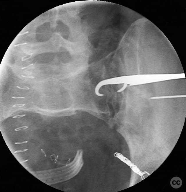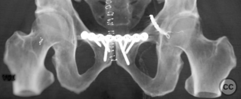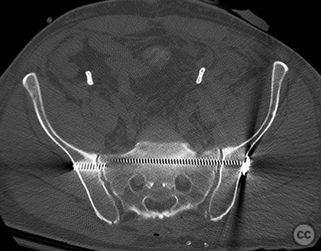 Operative remarks:The sequence of anterior then posterior fixation allowed unimpeded access to both injury sites. The use of a tenaculum clamp facilitated reduction of the complex posterior injury. No technical interference was encountered between anterior plate fixation and subsequent posterior iliosacral screw placement. The presence of embolic coils did not impede surgical access or reduction maneuvers.