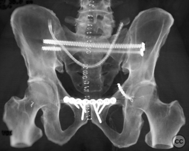 Orthopaedic implants used: 3.5 mm anterior symphyseal plate, cannulated iliosacral screws
