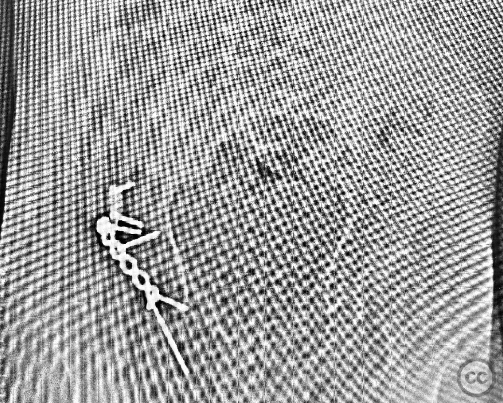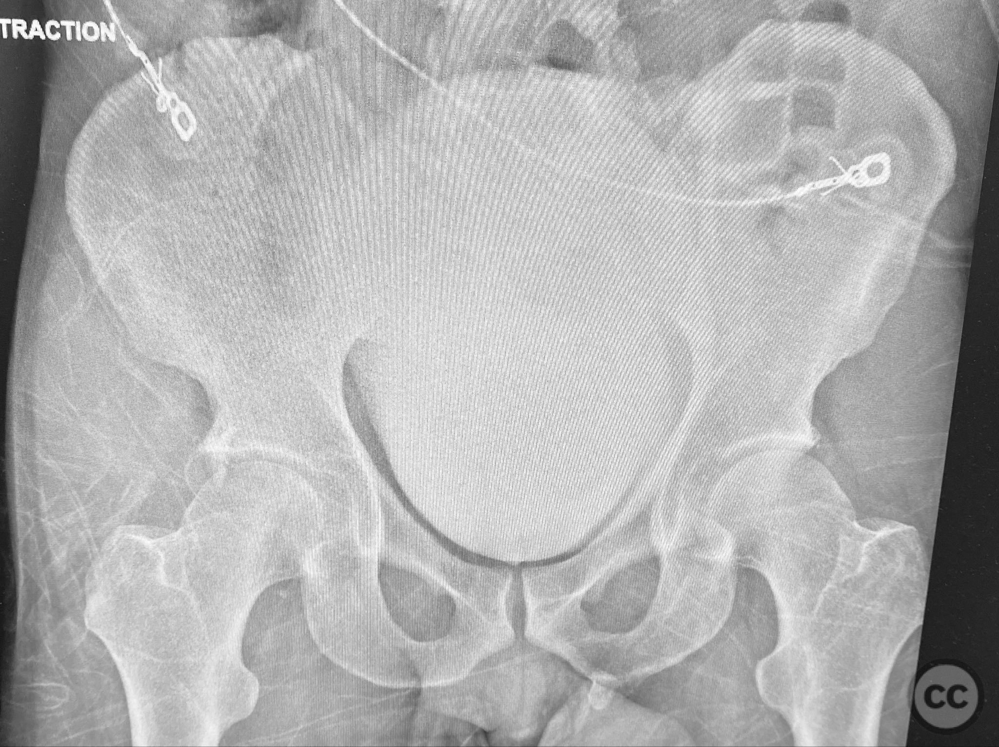 Patient positioning: The patient was positioned prone on a radiolucent table, with all pressure points padded. Skeletal traction was maintained via a distal femoral K-wire and tensioning bow throughout the procedure.