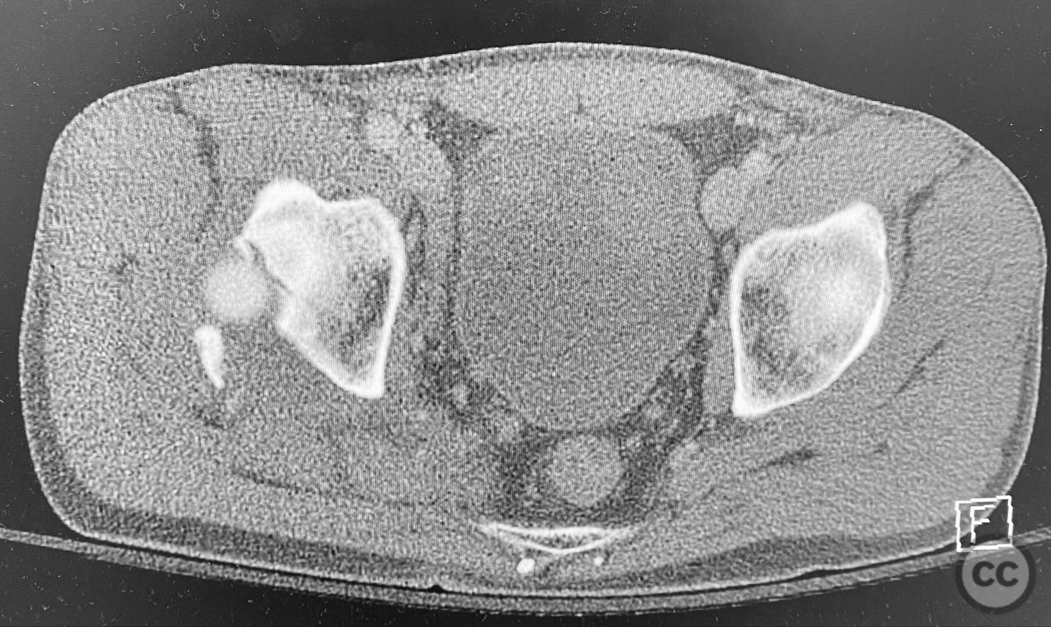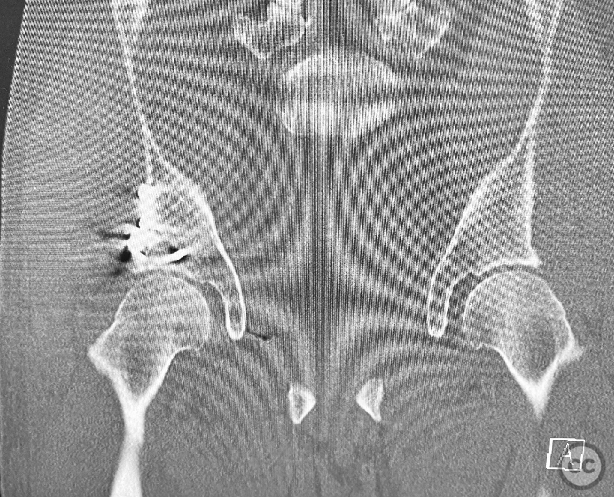 Clinical and radiological findings: A middle-aged patient sustained a posterior wall acetabular fracture-dislocation, as demonstrated on initial AP pelvic radiograph. The film revealed a sizeable posterior wall fragment, cranial lateral impaction of the acetabular dome, and subtle deformation of the femoral head contour. Neurovascular examination was performed, including assessment of distal pulses and sciatic nerve function. The ipsilateral knee and anterior chest were examined for associated injuries (including possible knee ligamentous injury and thoracic trauma). An initial attempt at closed reduction under sedation was unsuccessful.
