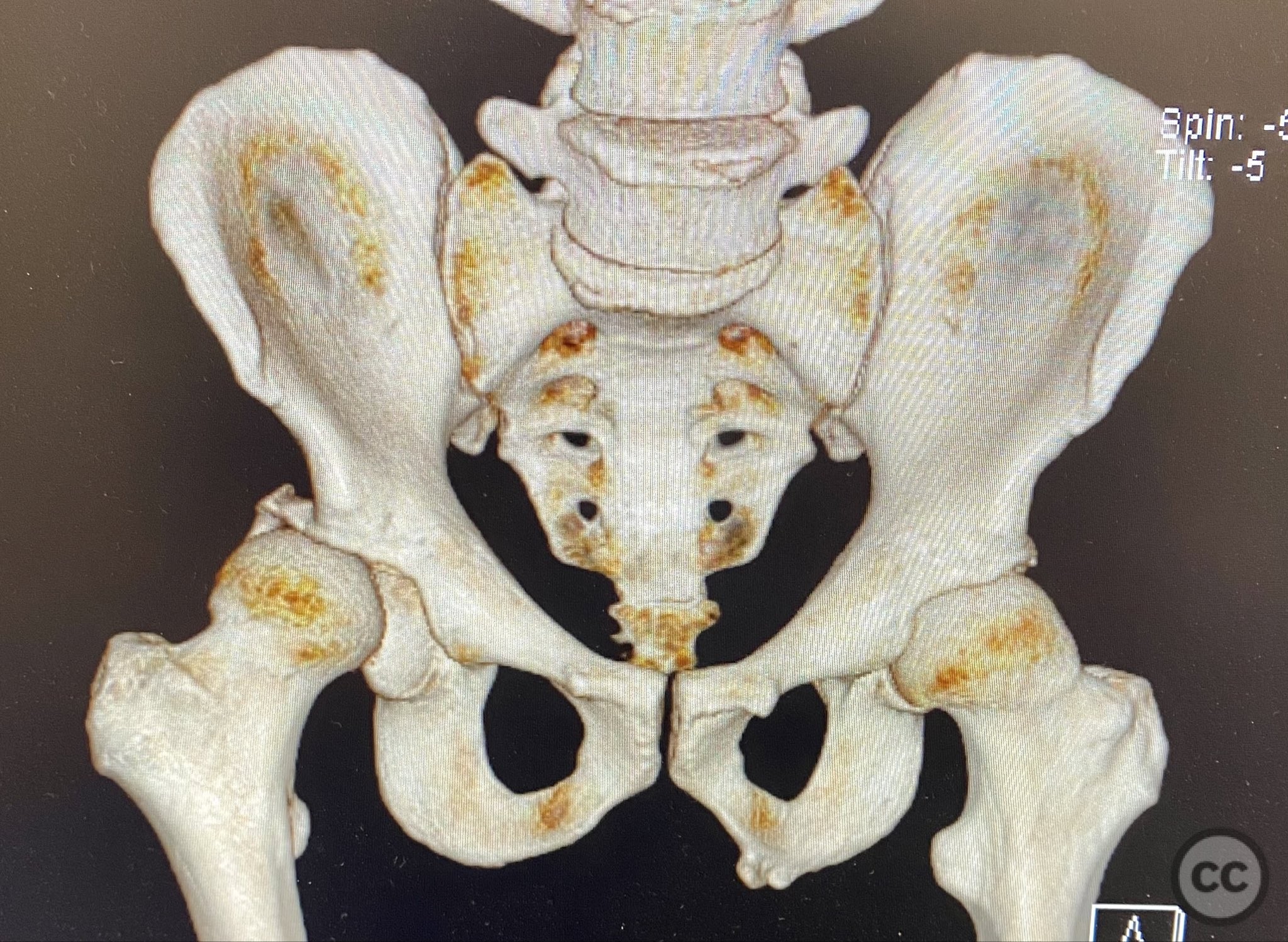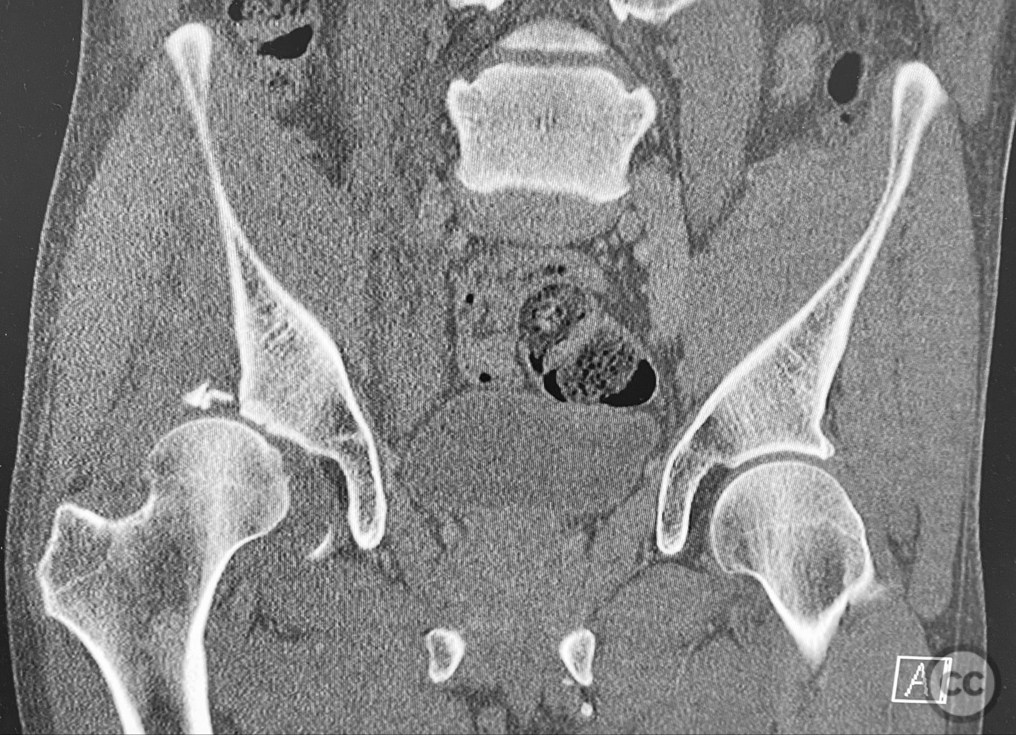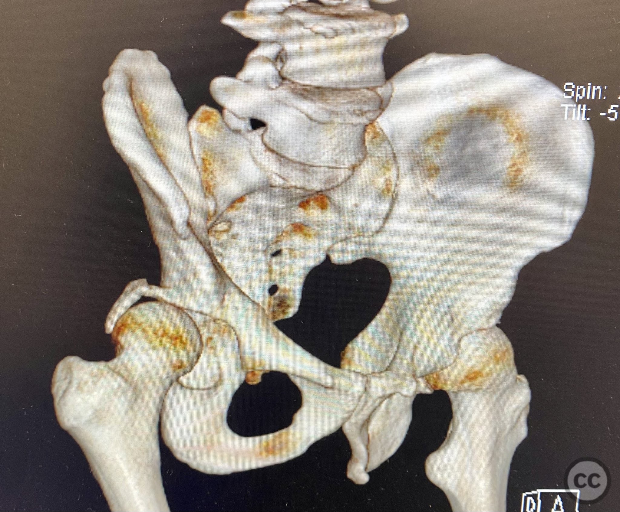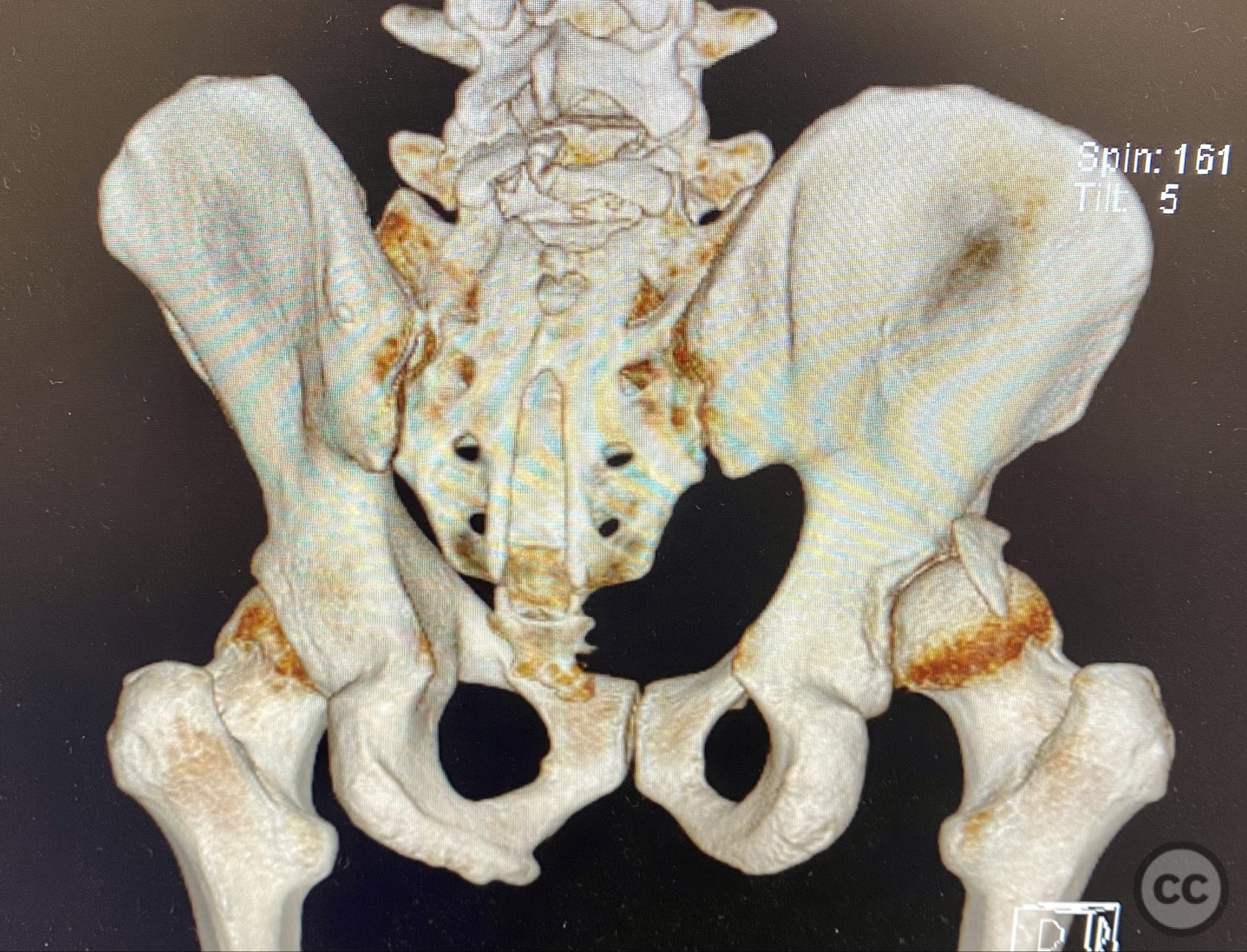 Planning remarks: The preoperative plan included advanced imaging with CT, including 3D surface renderings, to further delineate the extent of articular impaction, wall fragment size, and comminution. The plan was for open reduction and internal fixation via a posterior Kocher-Langenbeck approach in the prone position. Elevation of impacted articular segments was planned, with structural support using autologous bone graft harvested from the greater trochanter. Fragment-specific fixation was planned with a spring hook plate for the cranial wall fragment and a reconstruction plate for the main posterior wall fragment.