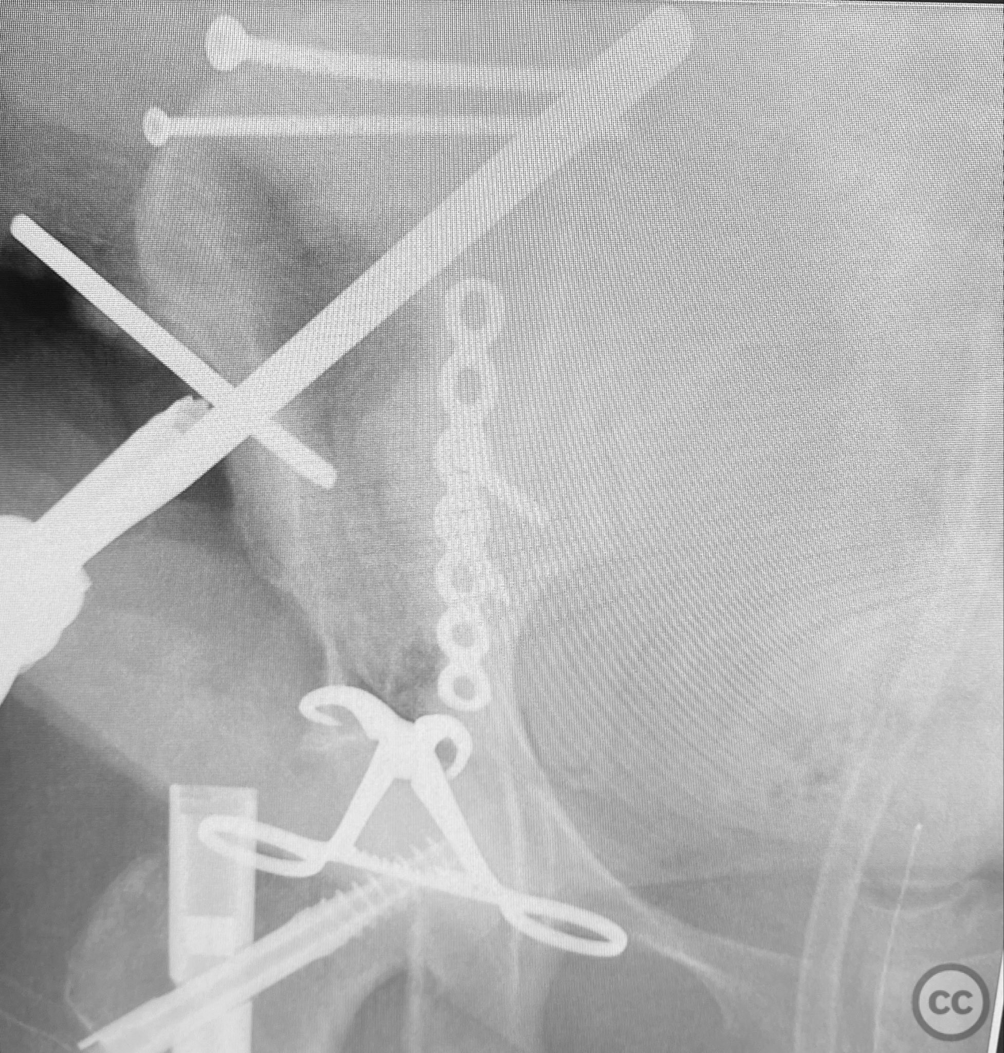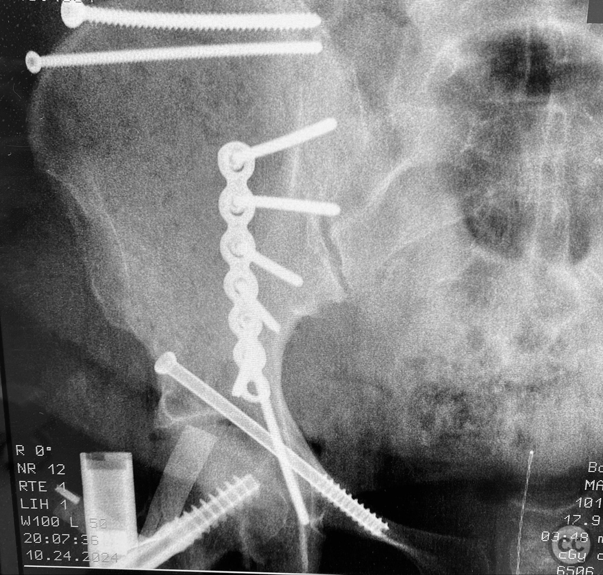 Operative remarks:Due to significant obesity and depth of exposure, visualization of fracture surfaces required meticulous retraction and soft tissue management. Reduction was achieved using a combination of colinear clamps (applied via an iliac manipulative pin) and medium tenaculum clamps (secured through a medial bone hole). These clamps maintained reduction without obstructing subsequent implant placement. The sequence of fixation was: first, lag screws were placed across the iliac crest fracture components; second, a neutralization plate was applied along the pelvic brim with additional lag screws securing the anterior column; third, a percutaneous cannulated lag screw was inserted across the superior pubic ramus. A brim medullary screw was deliberately avoided to prevent obstruction of optimal implant placement. The plate functioned primarily as a linear washer for the lag screws rather than as a load-bearing device.