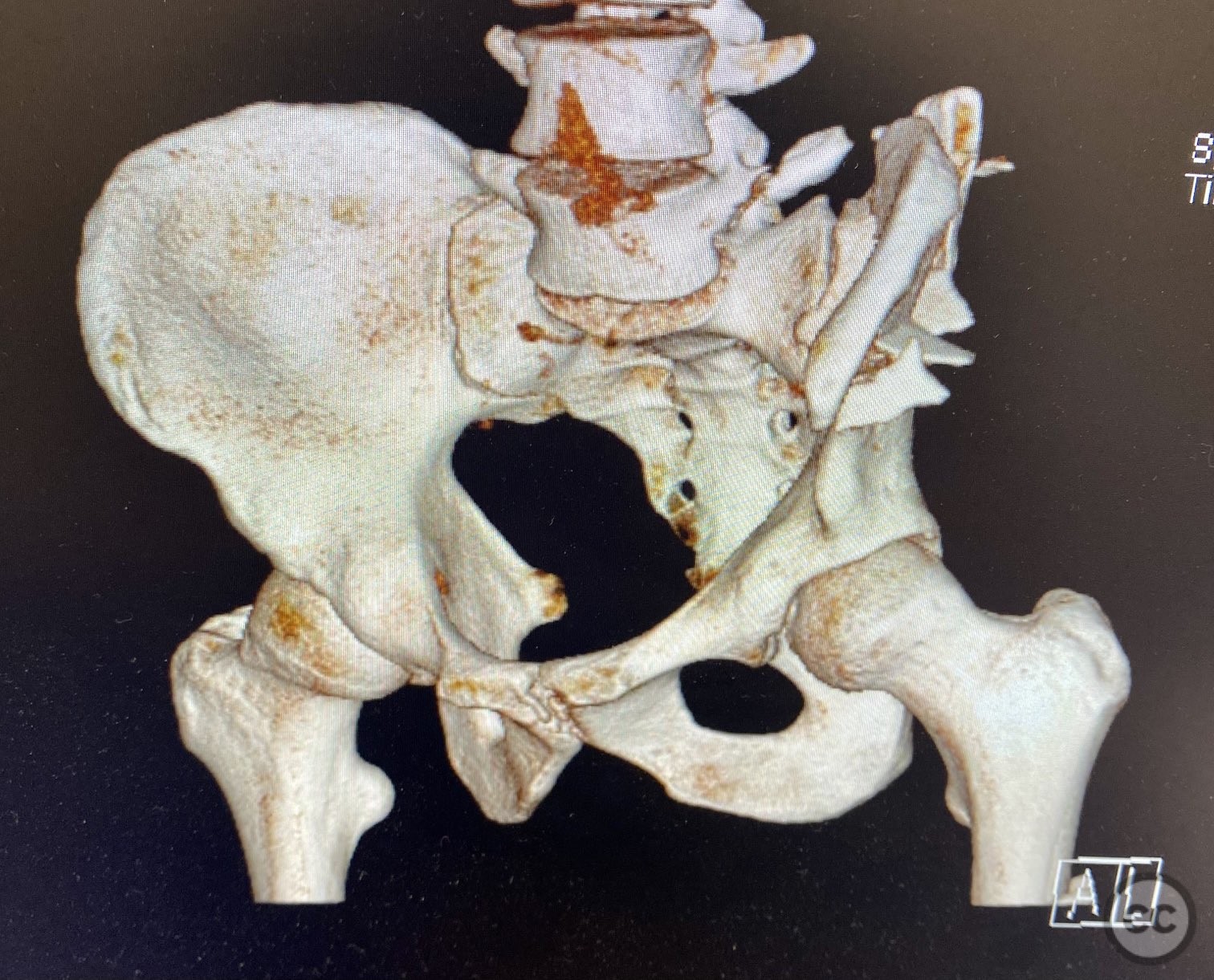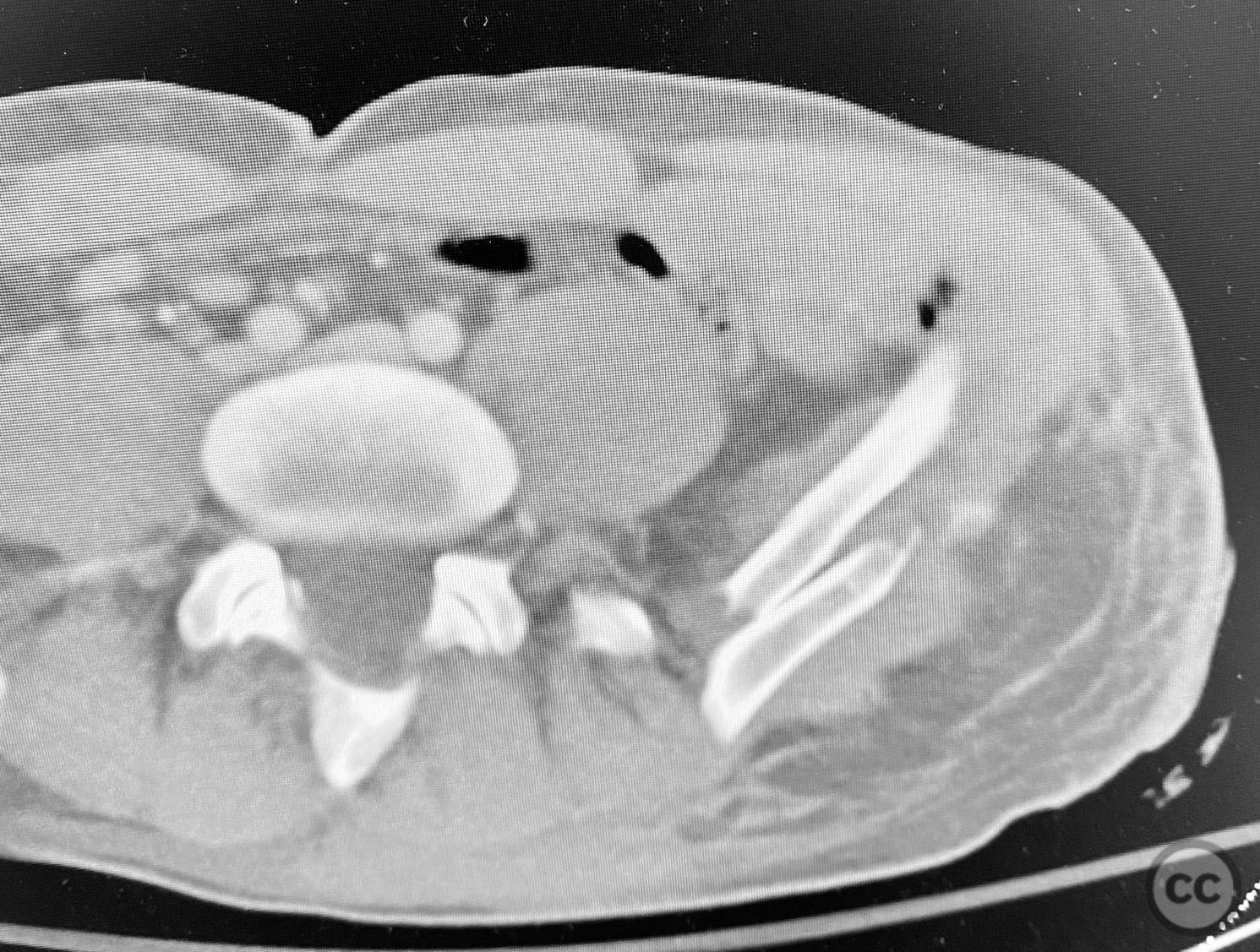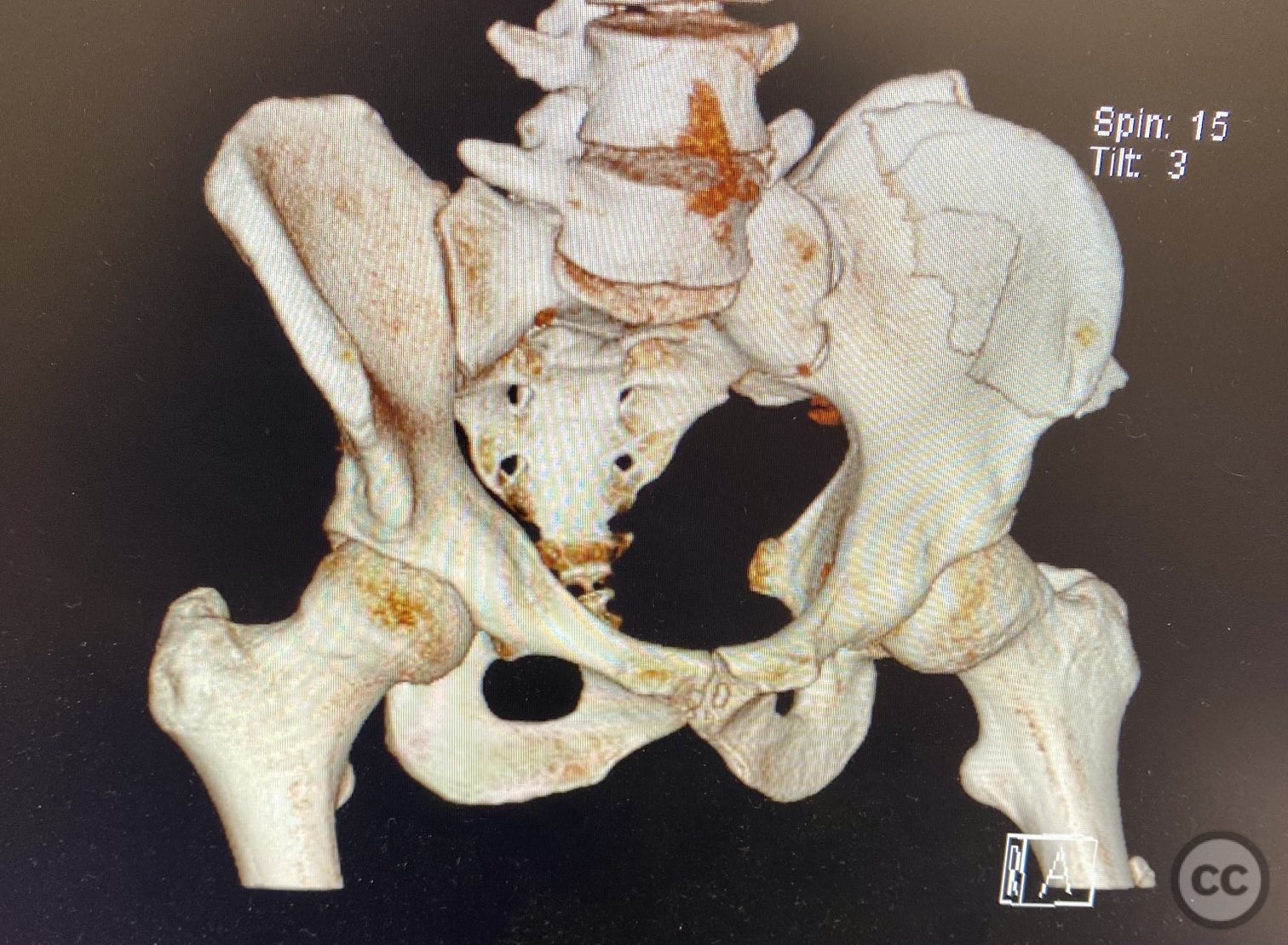 Clinical and radiological findings: A patient sustained a high-energy injury resulting in an open, comminuted fracture of the iliac wing, sparing the pelvic ring. Associated injuries included spine, rib, and femur fractures. Initial radiographs and axial CT imaging demonstrated significant comminution of the iliac wing with intraosseous air densities indicative of an open wound. No pelvic ring disruption was identified. AO/OTA classification: 61-A2. The presence of multiple associated injuries is consistent with a direct lateral load mechanism.