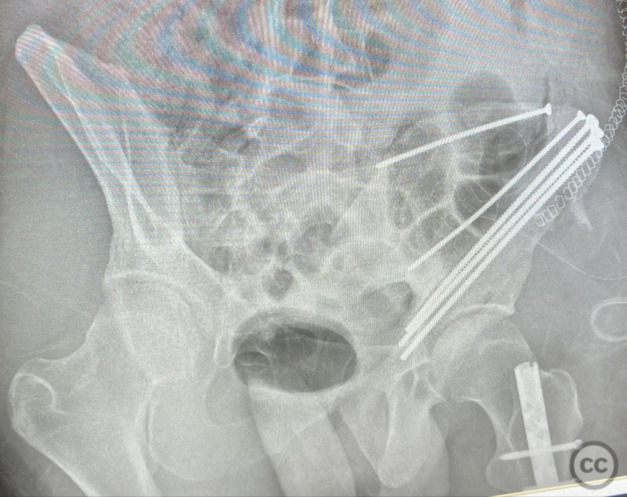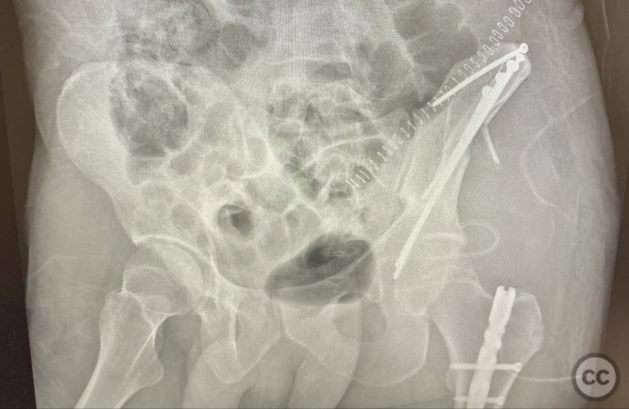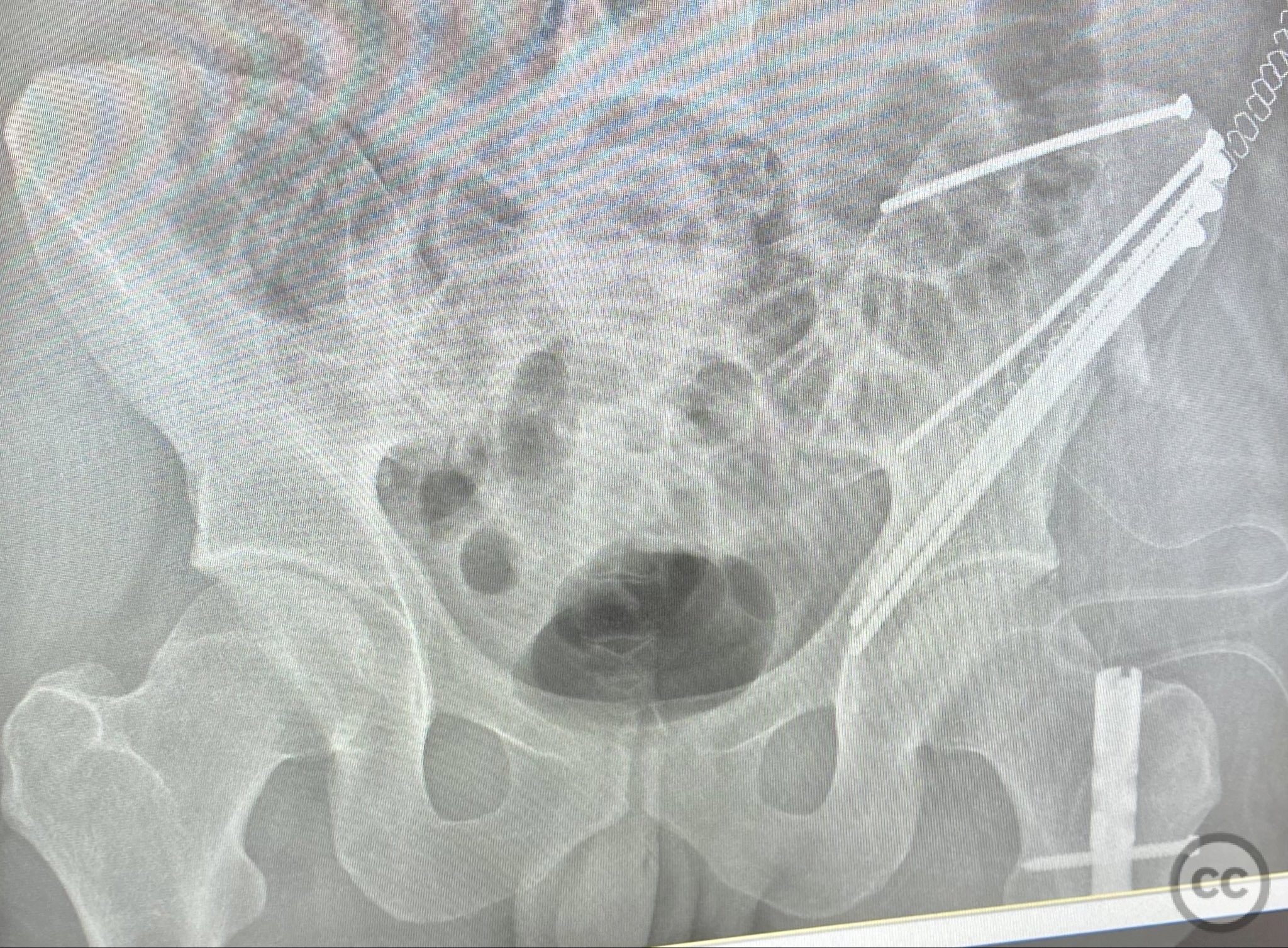 Clinical and radiological findings: A patient sustained a high-energy injury resulting in an open, comminuted fracture of the iliac wing, sparing the pelvic ring. Associated injuries included spine, rib, and femur fractures. Initial radiographs and axial CT imaging demonstrated significant comminution of the iliac wing with intraosseous air densities indicative of an open wound. No pelvic ring disruption was identified. AO/OTA classification: 61-A2. The presence of multiple associated injuries is consistent with a direct lateral load mechanism.
