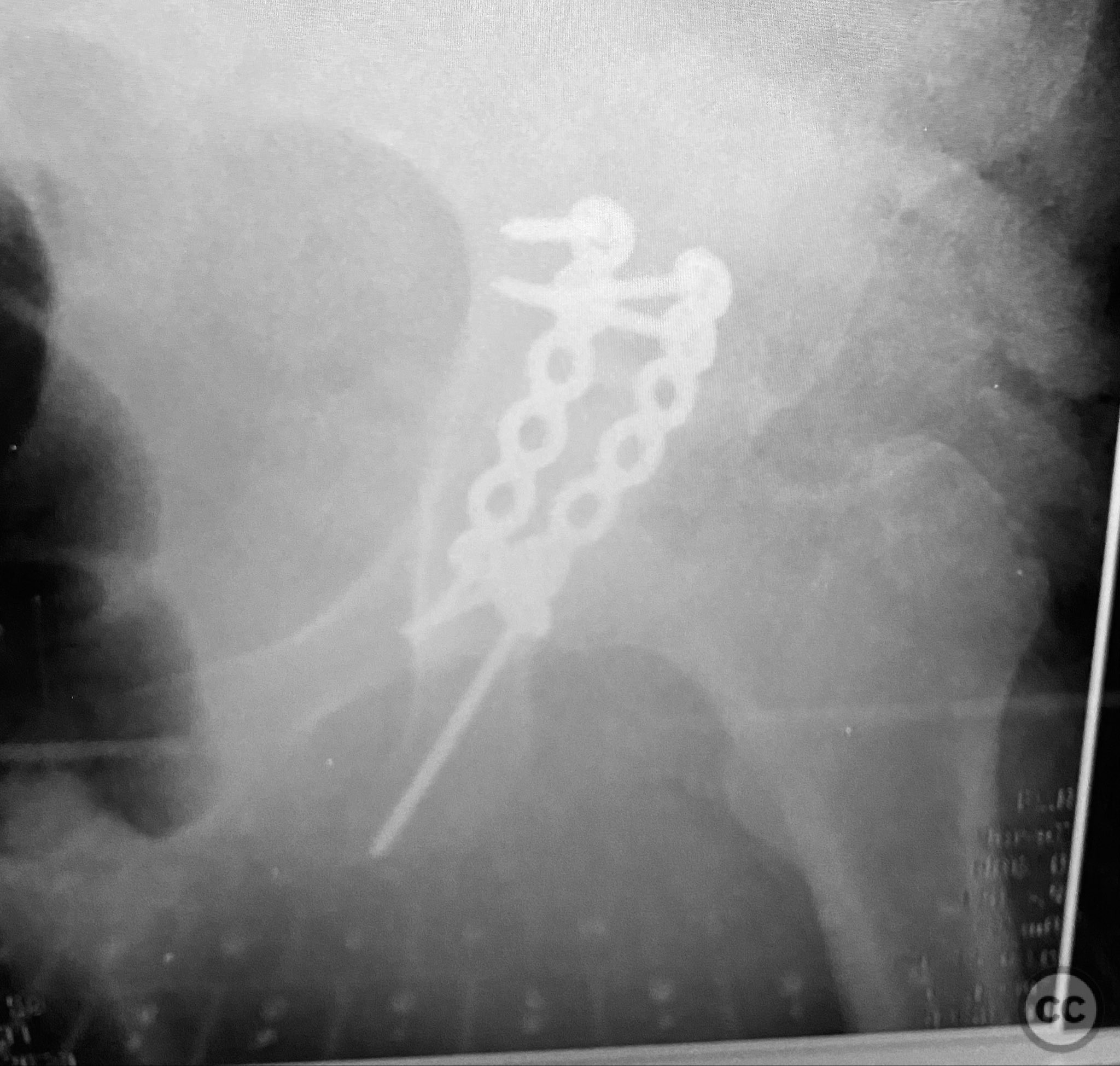 Operative remarks:Morbid obesity significantly complicated intraoperative exposure, anatomical landmark identification, retraction, and fluoroscopic imaging. A 2mm pin placed under C-arm guidance facilitated accurate identification of the femoral shaft for limb positioning. Retrieval of the intra-articular chondrocancellous fragment required careful dissection near the greater sciatic notch. After reduction of all fragments, contoured plates and screws were applied to maintain stability. Postoperative imaging confirmed accurate reduction and appropriate implant placement. Wound management strategies were employed to mitigate increased risk of complications associated with obesity.