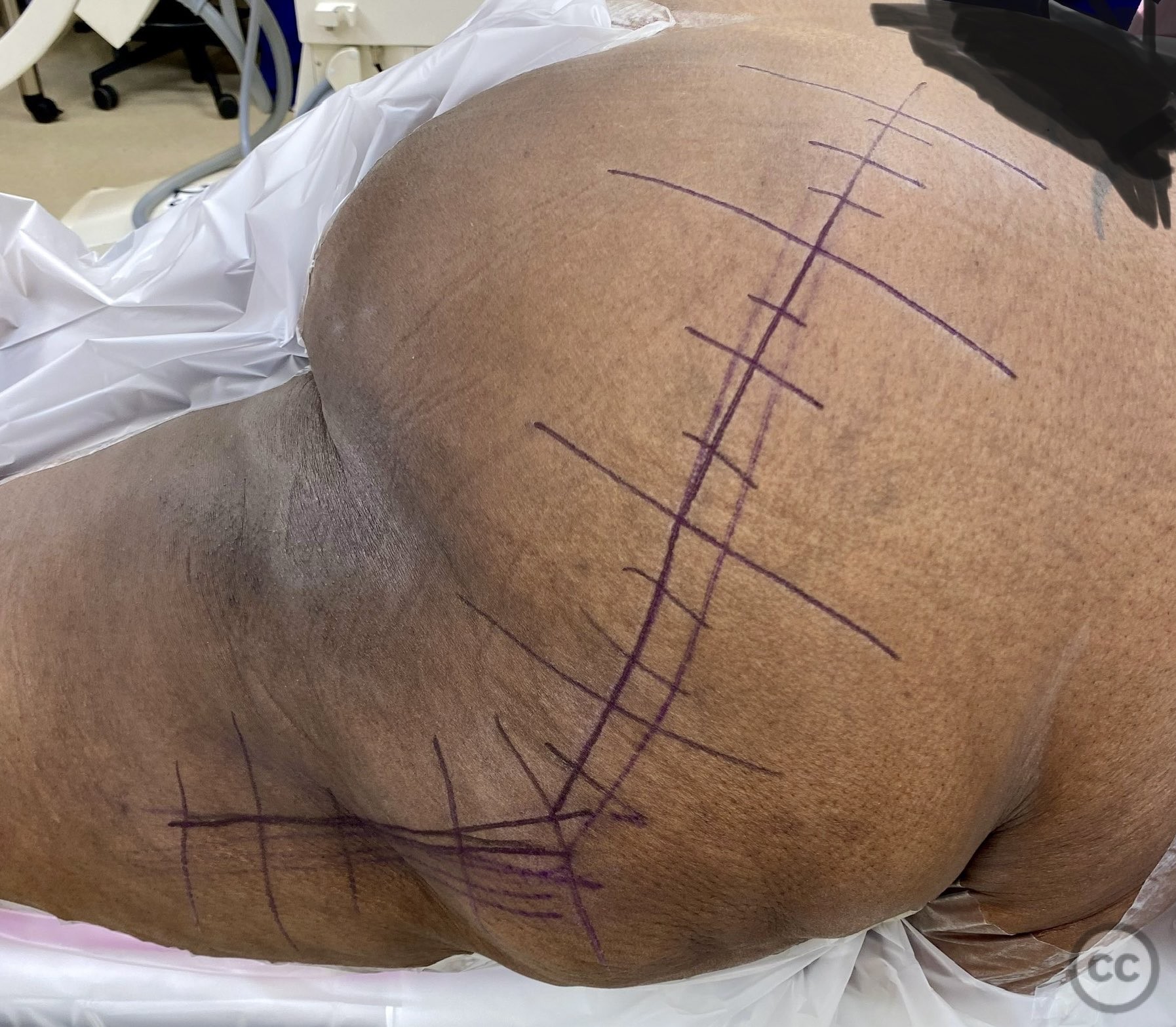 Patient positioning: The patient was positioned in the lateral decubitus position. Due to body habitus, a 2mm Steinmann pin was placed under fluoroscopic guidance to accurately identify the femoral shaft and facilitate correct limb alignment intraoperatively.