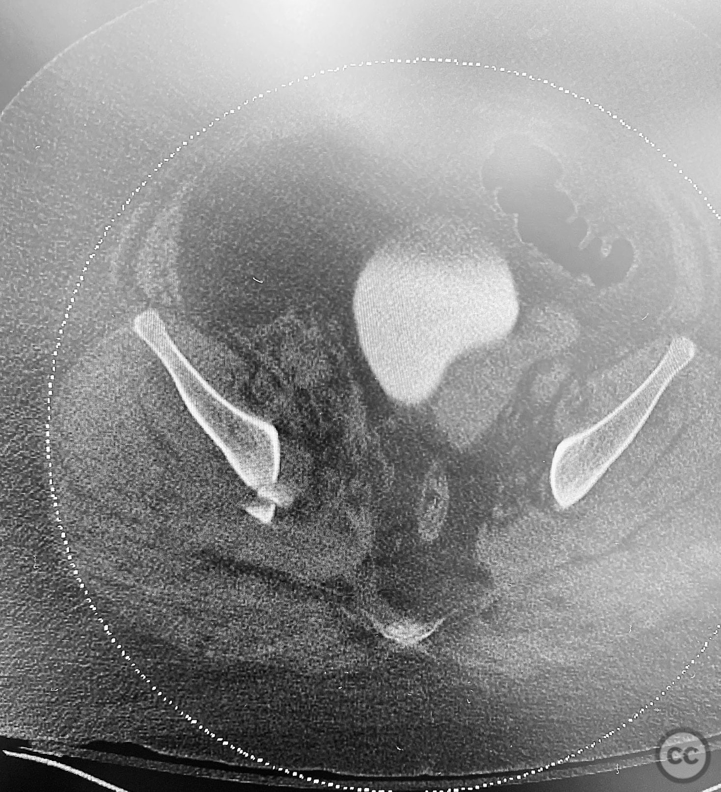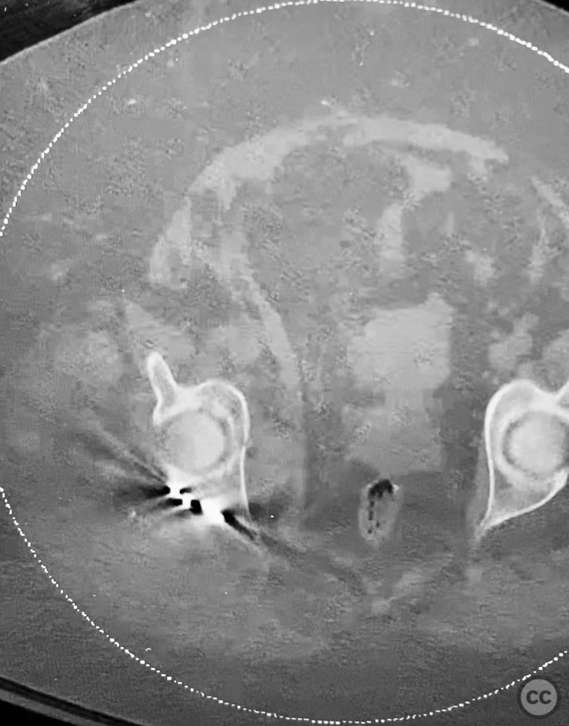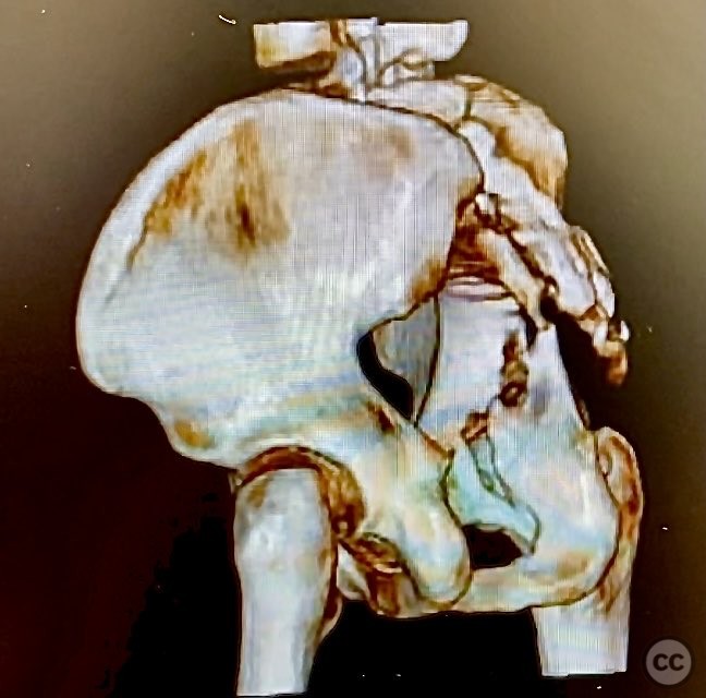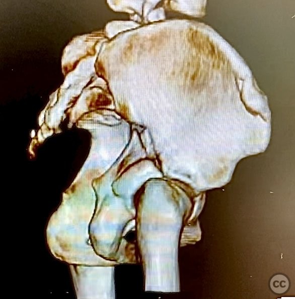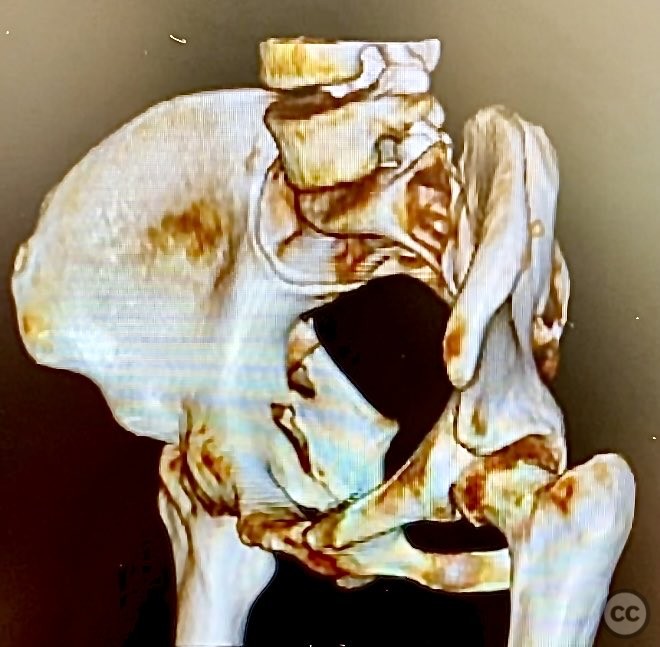 Clinical and radiological findings: The patient is morbidly obese and sustained an unstable, displaced posterior column/posterior wall (PC/PW) acetabular fracture. Axial computed tomography images revealed a 2x2x1.5 cm pyramidal chondrocancellous articular fragment wedged in the fracture plane near the incisura ischiadica major (greater sciatic notch). Surface-rendered reconstructions further delineated the fracture morphology and fragment position. Obesity was noted to complicate all aspects of management, including anatomical localization, intraoperative imaging, and soft tissue handling.