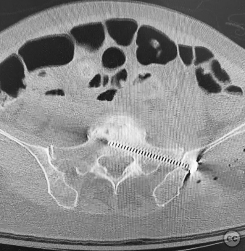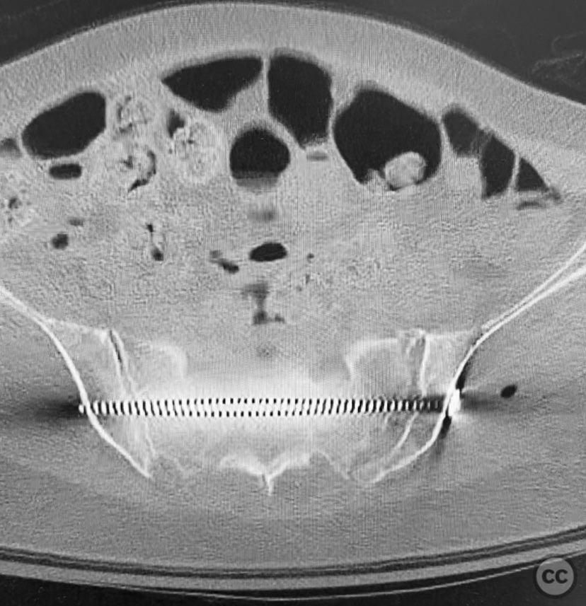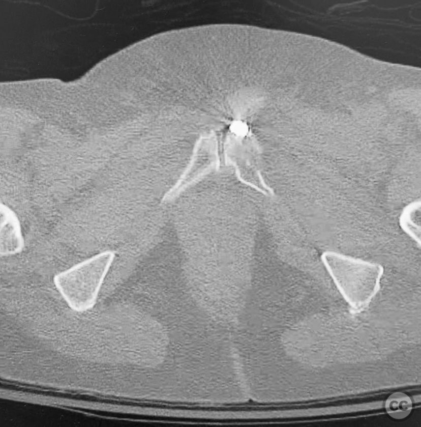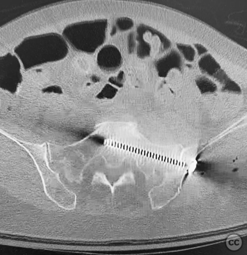 Operative remarks:Intraoperatively, manual manipulation of the pelvis was performed to achieve improved reduction prior to fixation. The stability achieved by percutaneous screw fixation provided immediate symptomatic relief, allowing for early mobilization. The procedure emphasized meticulous attention to fluoroscopic imaging and preoperative CT planning to avoid neurovascular compromise and optimize screw trajectory within osteoporotic bone.