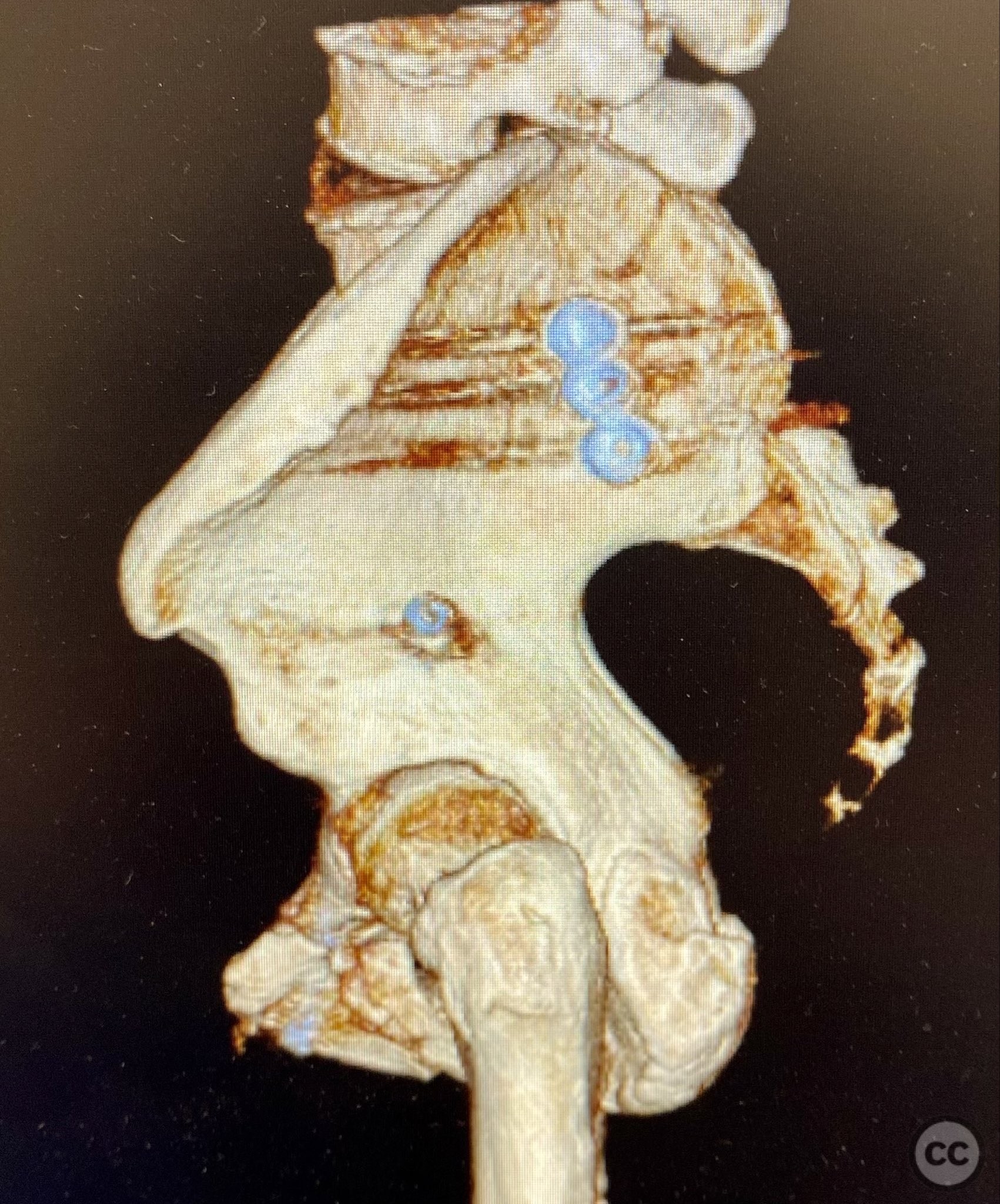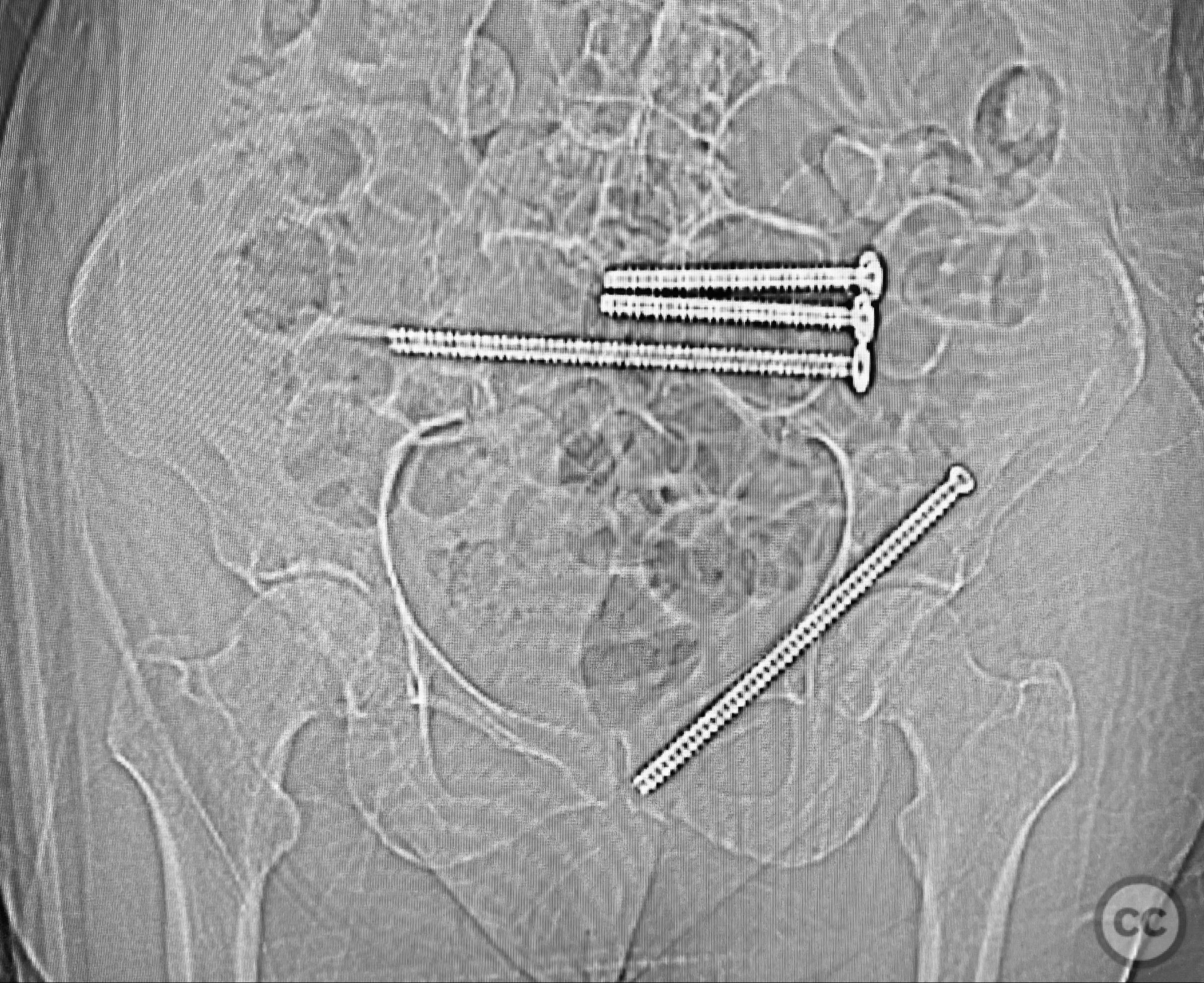 Anatomical surgical approach: Percutaneous technique was employed. Small stab incisions were made over the lateral aspect of the pelvis. Under continuous fluoroscopic guidance, guidewires were advanced through the ilium into the sacrum (iliosacral region) and through the superior pubic ramus. Cannulated screws were then inserted over the guidewires, ensuring extra-articular and intraosseous positioning within the safe bone corridors as determined by preoperative CT analysis.