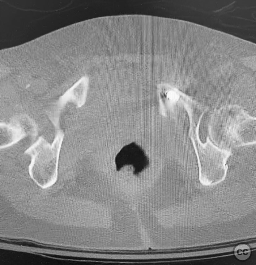 Clinical and radiological findings: A 74-year-old female presented following a fall from standing height, unable to mobilize due to severe pelvic pain (9/10). Examination under anesthesia with fluoroscopic assessment (AP and inlet views) demonstrated instability and displacement of the pelvic ring with minimal manual compression at the iliac crests. Imaging revealed left-sided posterior iliac/sacral and pubic ramus fractures consistent with an AO/OTA 61-B2 (lateral compression type) pelvic ring injury. No neurovascular deficits were noted.
