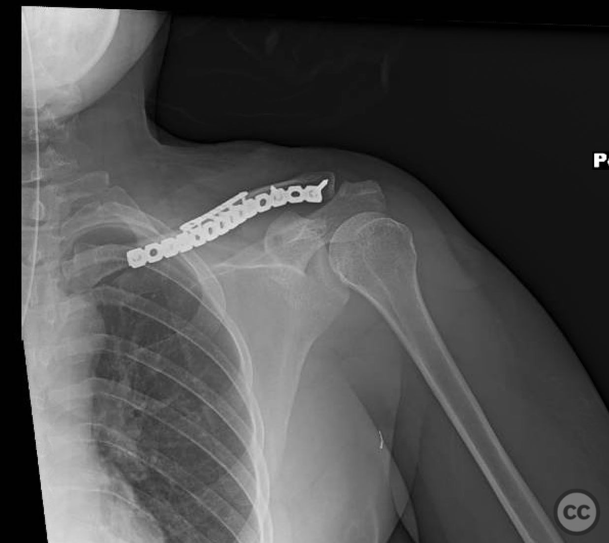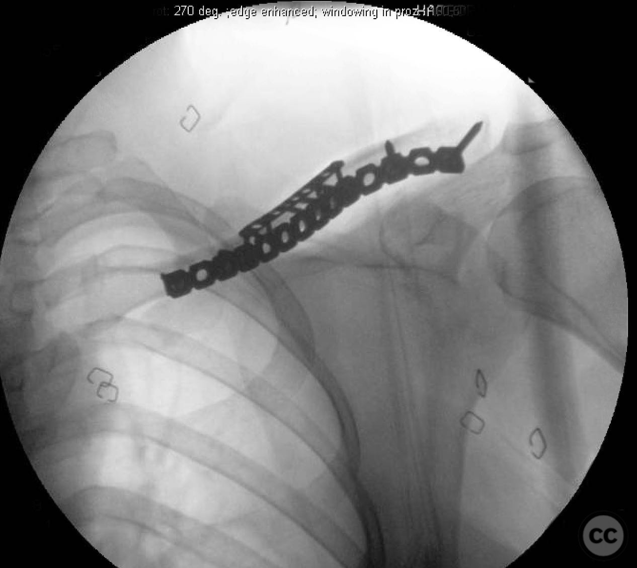 Operative remarks:During the procedure, anatomic reduction of the butterfly fragments was achieved using 2.4mm lag screws for interfragmentary compression. The main segment reduction proved challenging due to instability; hence, a 2.4mm "clamp replacement plate" was temporarily used to maintain reduction. A reconstruction plate was contoured and applied to the anterior inferior clavicle, providing a neutralization construct. Absolute stability was achieved, anticipating primary bone healing.