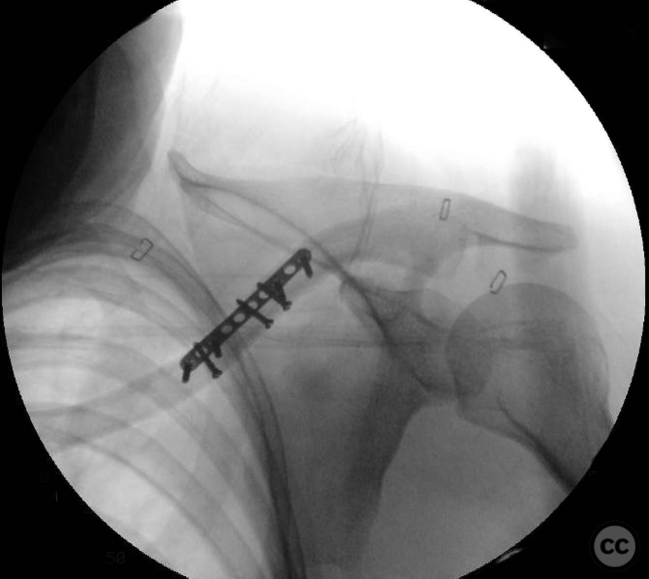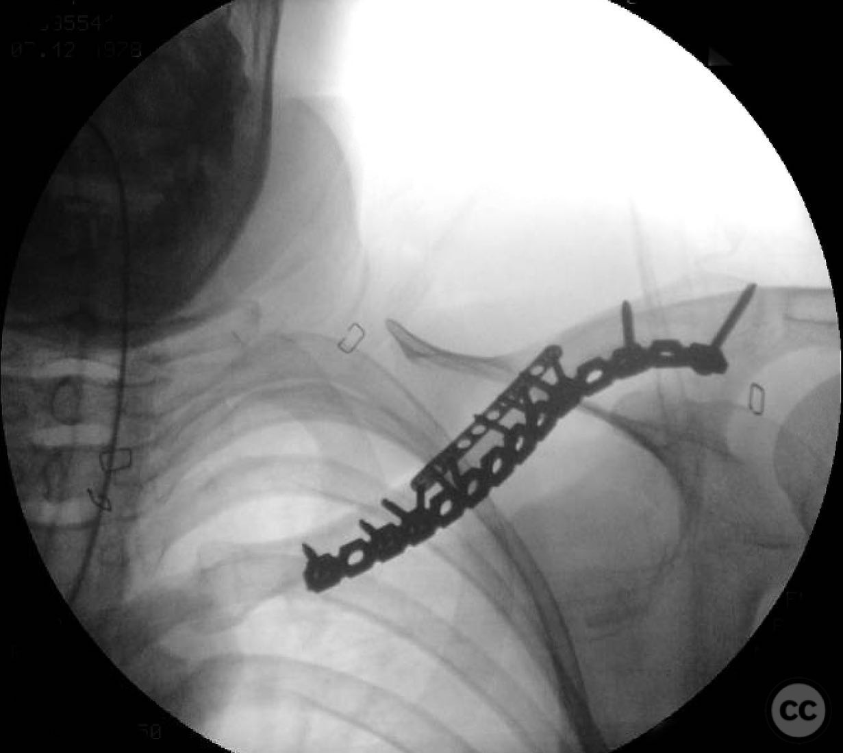Planning remarks: The preoperative plan involved direct exposure of the fracture site with anatomic clamp reduction. Interfragmentary compression was planned using lag screws for the butterfly fragments, followed by application of a reconstruction plate on the anterior inferior aspect of the clavicle for neutralization.