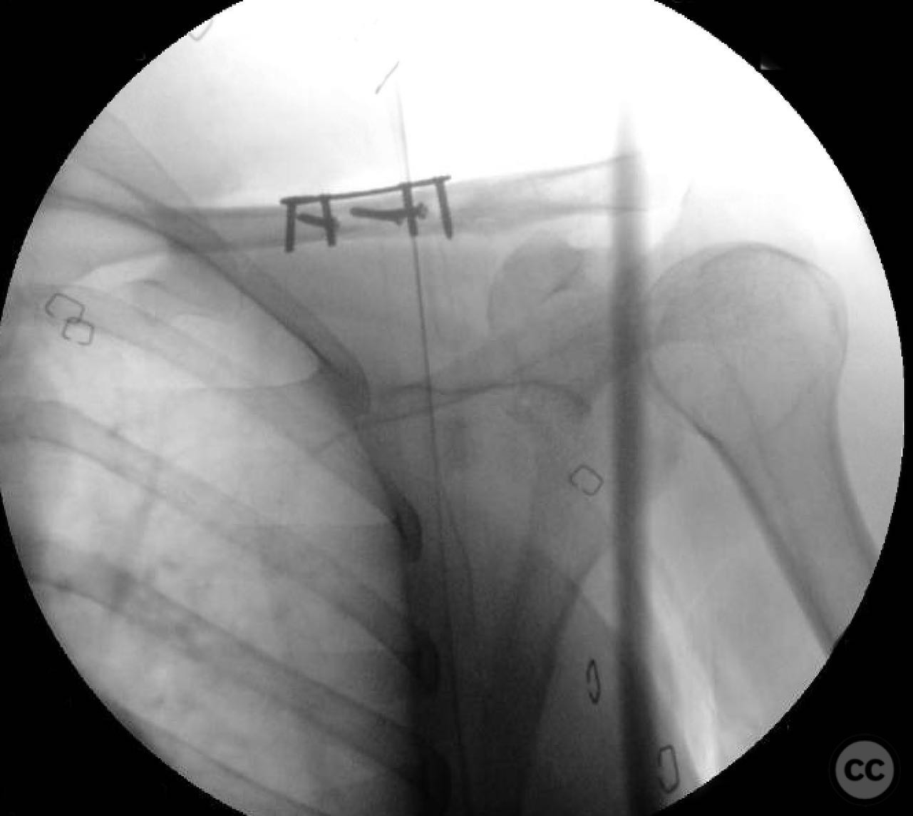 Patient positioning: The patient was positioned supine on the operating table with a small sandbag placed between the scapulae to elevate the shoulder girdle, facilitating access to the clavicle.